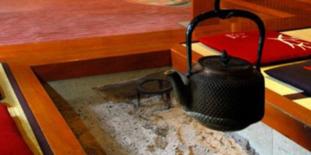 檜の香り漂うお部屋でのんびり、囲炉裏、民芸調家具、鉄瓶に囲まれ、