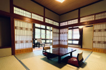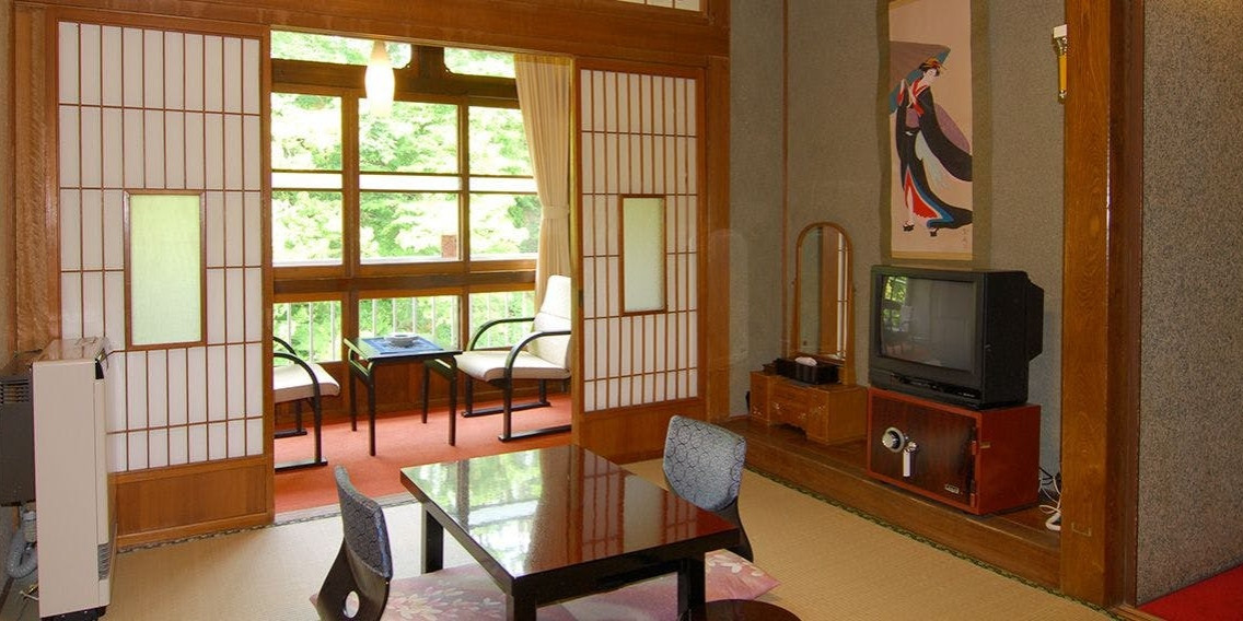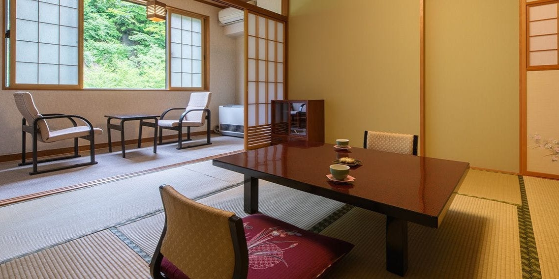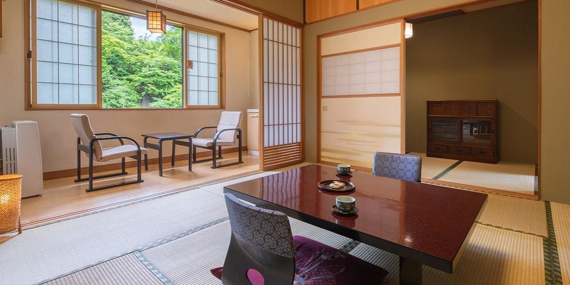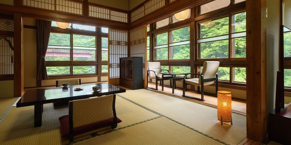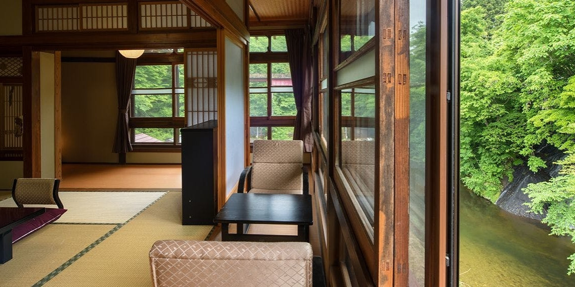 渓流を2面の窓から望める2間つづきの和室8帖+6帖角部屋のお部屋です。
