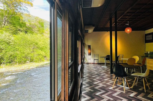 落ち着いた和モダンの内装とパノラマに広がる大自然の景観のある空間を、