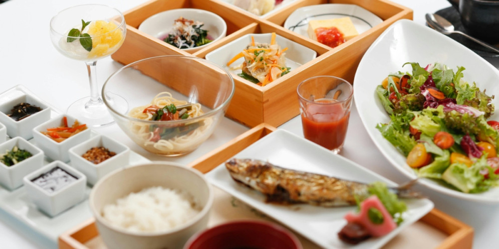 地元産の野菜と魚を和食をベースにして、松村シェフの創意や心遣いあふれる朝食をお出ししています。炊きたての白いご飯とお味噌汁、旬のお魚を中心に、手をかけた料理が小鉢で提供され、たくさんの種類を楽しめます。