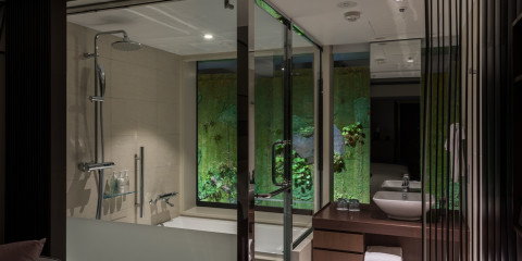 浴槽につかりながら眺めるモスウォールが癒しを与えてくれます。