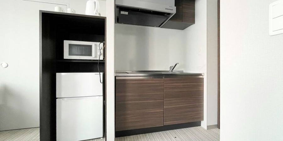 全室にキッチン、冷蔵庫、電子レンジ、調理器具、食器が完備されており、自炊が可能です。