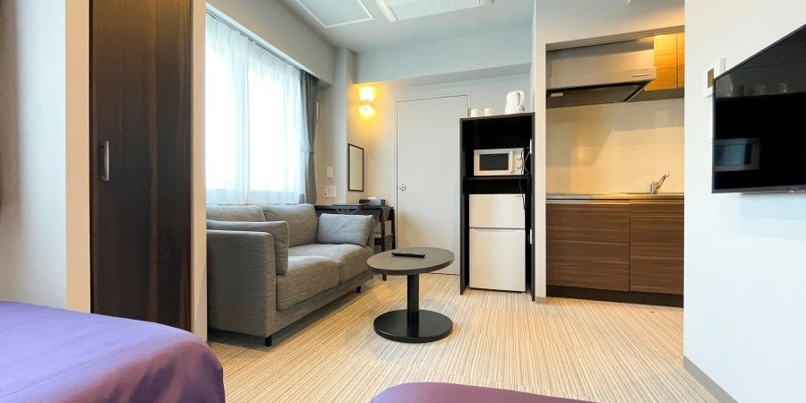 洗練された空間にキッチンや家具・家電を完備して長期滞在にも対応。お一人でもゆったり過ごせる