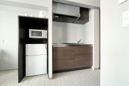 全室にキッチン、冷蔵庫、電子レンジ、調理器具、食器が完備されており、自炊が可能です。