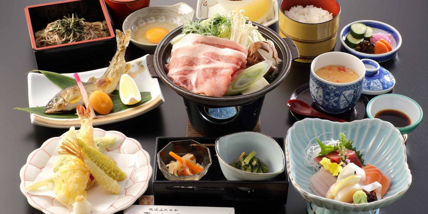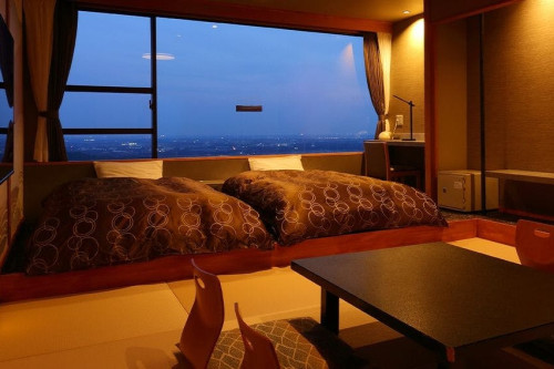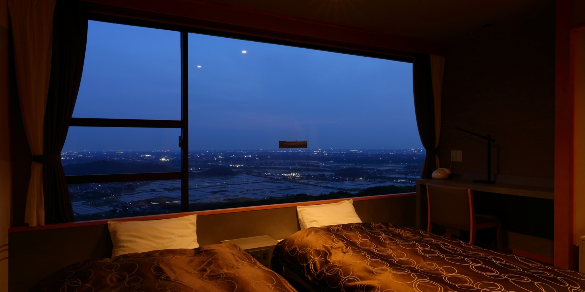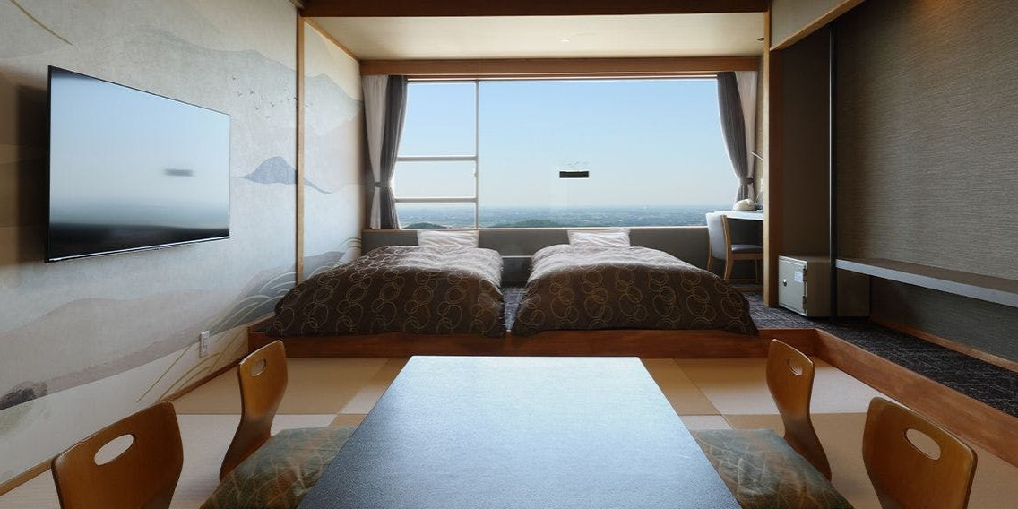 眼下に筑波の町並み、遠くに東京・富士山を眺めながら、お部屋でゆったりとお風呂につかり、お料理を楽しみ下さい。