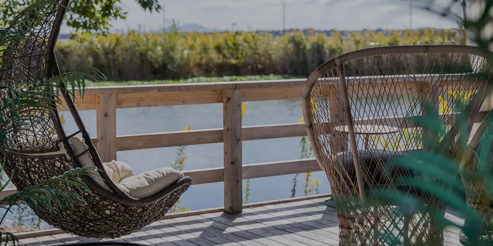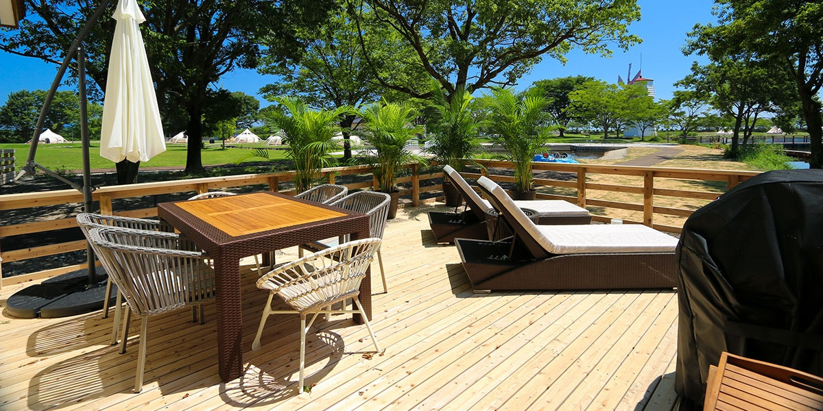 広々とした専用デッキバルコニーで優雅に過ごすアウトドアグランピングを。