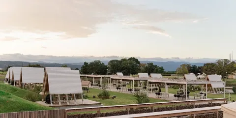 宿泊グランピングでは、3種類のお部屋タイプ(キャビン、ドームテント、ロータスベルテント)をご用意しており、夕食・朝食ともにプライベートデッキでお召し上がりいただけます。