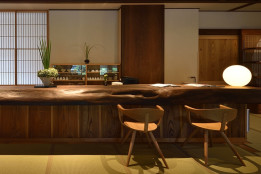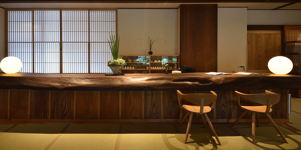 お客さまをまずお迎えするのが、フロントに据えられた長大な神代欅のカウンター。