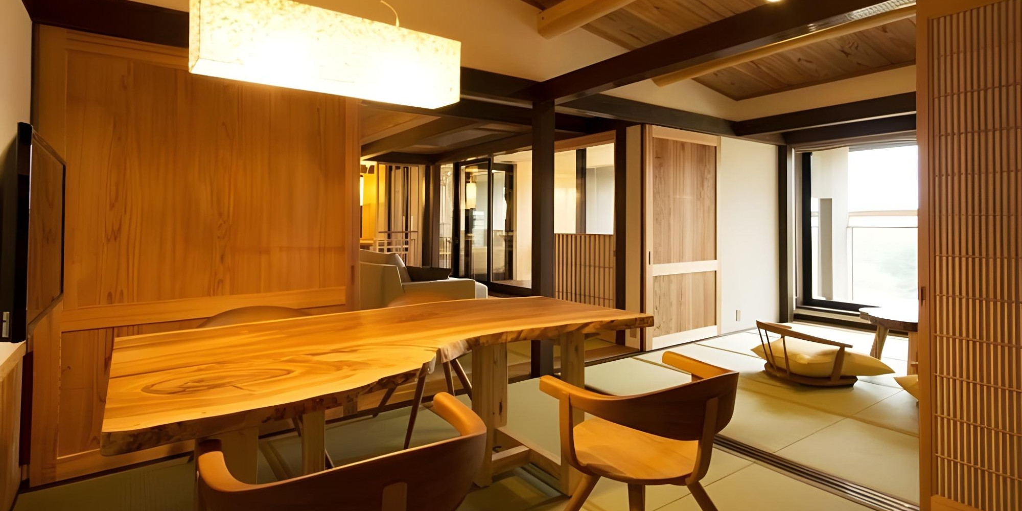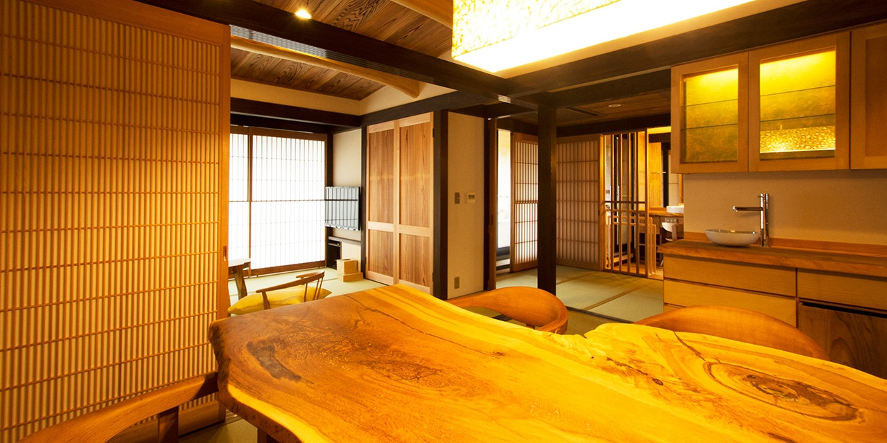 白壁、格子、掘り炬燵の板間。和の意匠で組み上げられていながらなお、