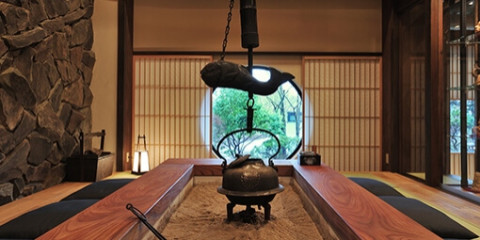 囲炉裏がしつらえられた畳敷きの和室、