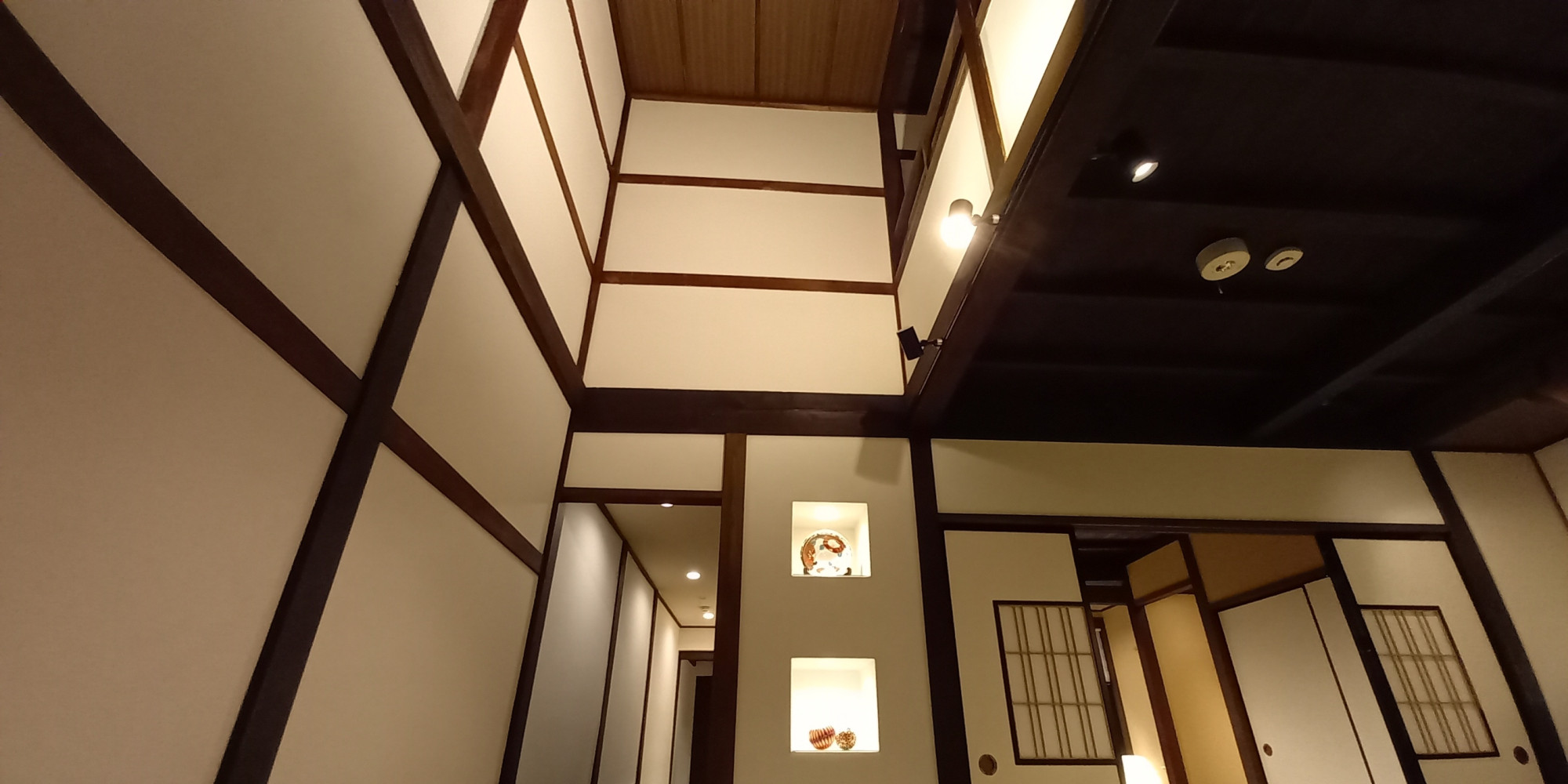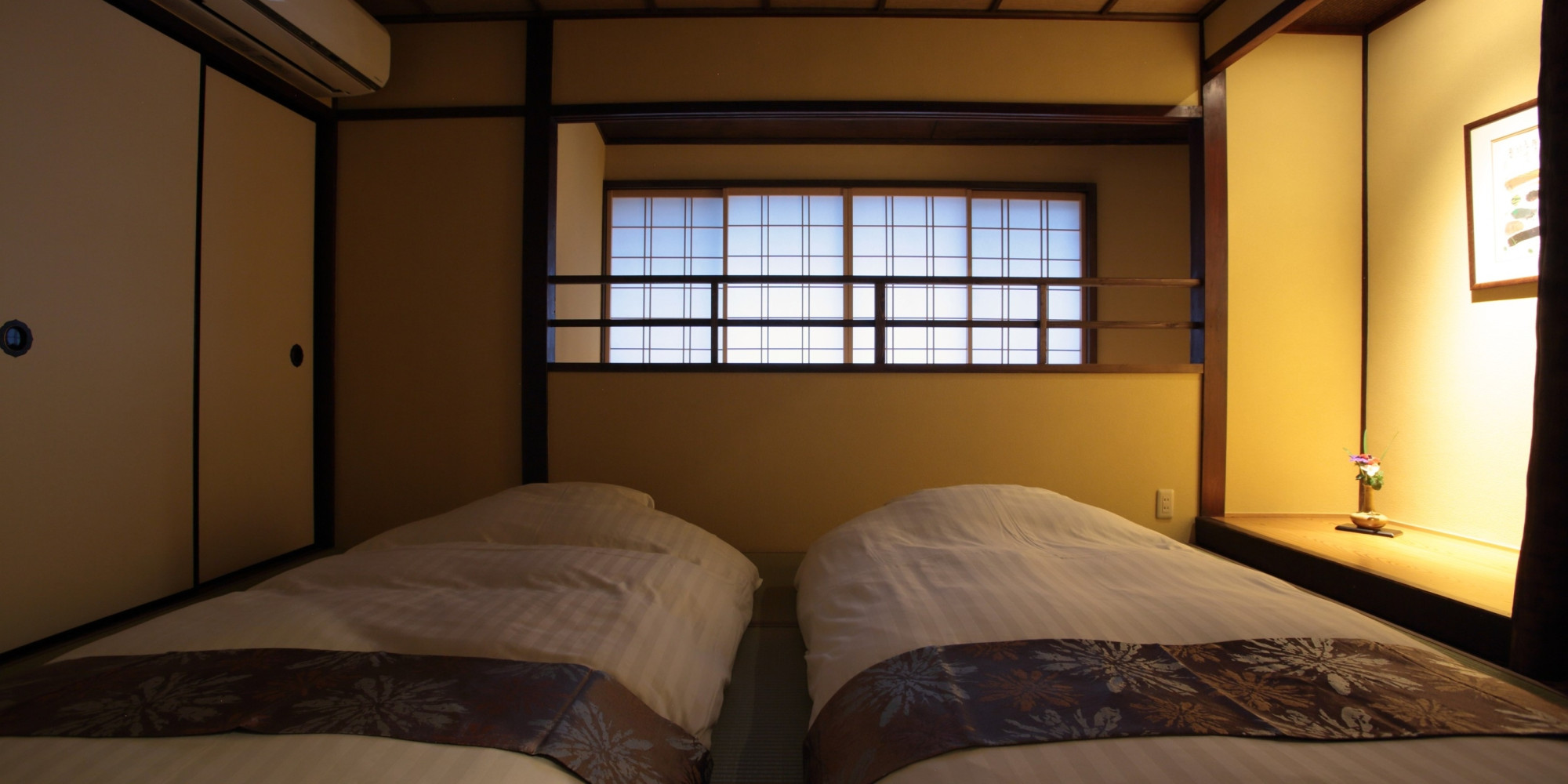 二階和室は二部屋あり、お布団でお休みいただきます。淡い照明に時を忘れ、