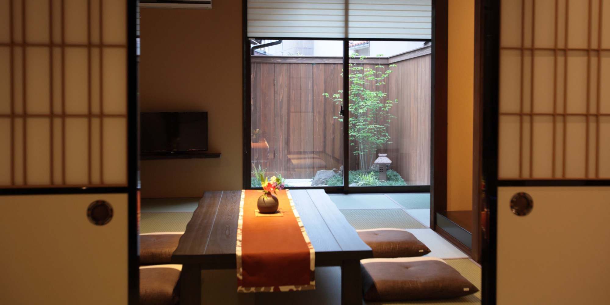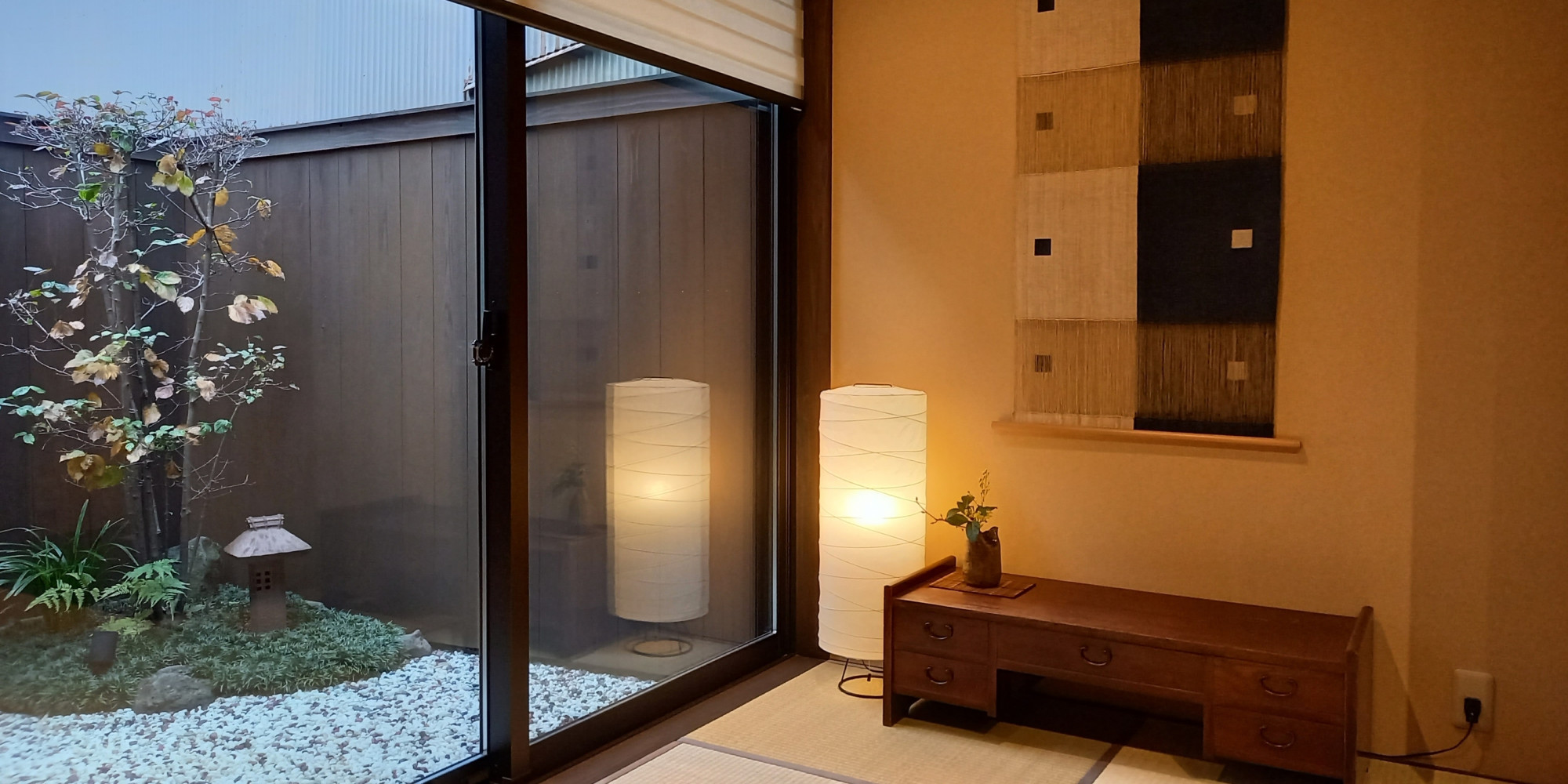 開放感のある空間になっております。居間から見える坪庭は、夕刻から明りが灯ると表情をがらりと変え、
