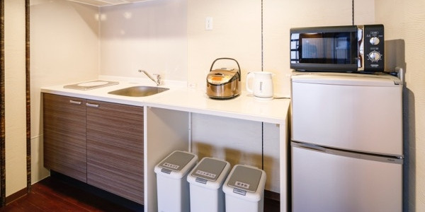 冷蔵庫/ 電子レンジ/ IHクッキングヒーター/ 電気ケトル/ 包丁/ まな板/ フライパン/ 鍋/ ボール/ ざる /グラス/ 急須/ 湯呑/ 徳利、おちょこ/ コーヒーカップ 箸、スプーン /皿(大・中・小) 調味料(塩・胡椒・砂糖・醤油・サラダ油・オリーブオイル)