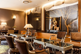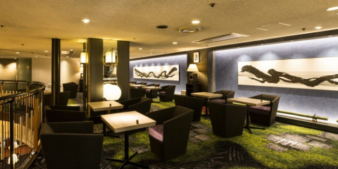 ラウンジ「遠州」は小堀遠州の”綺麗さび”をテーマに、苔庭や敷石をイメージした絨毯とし