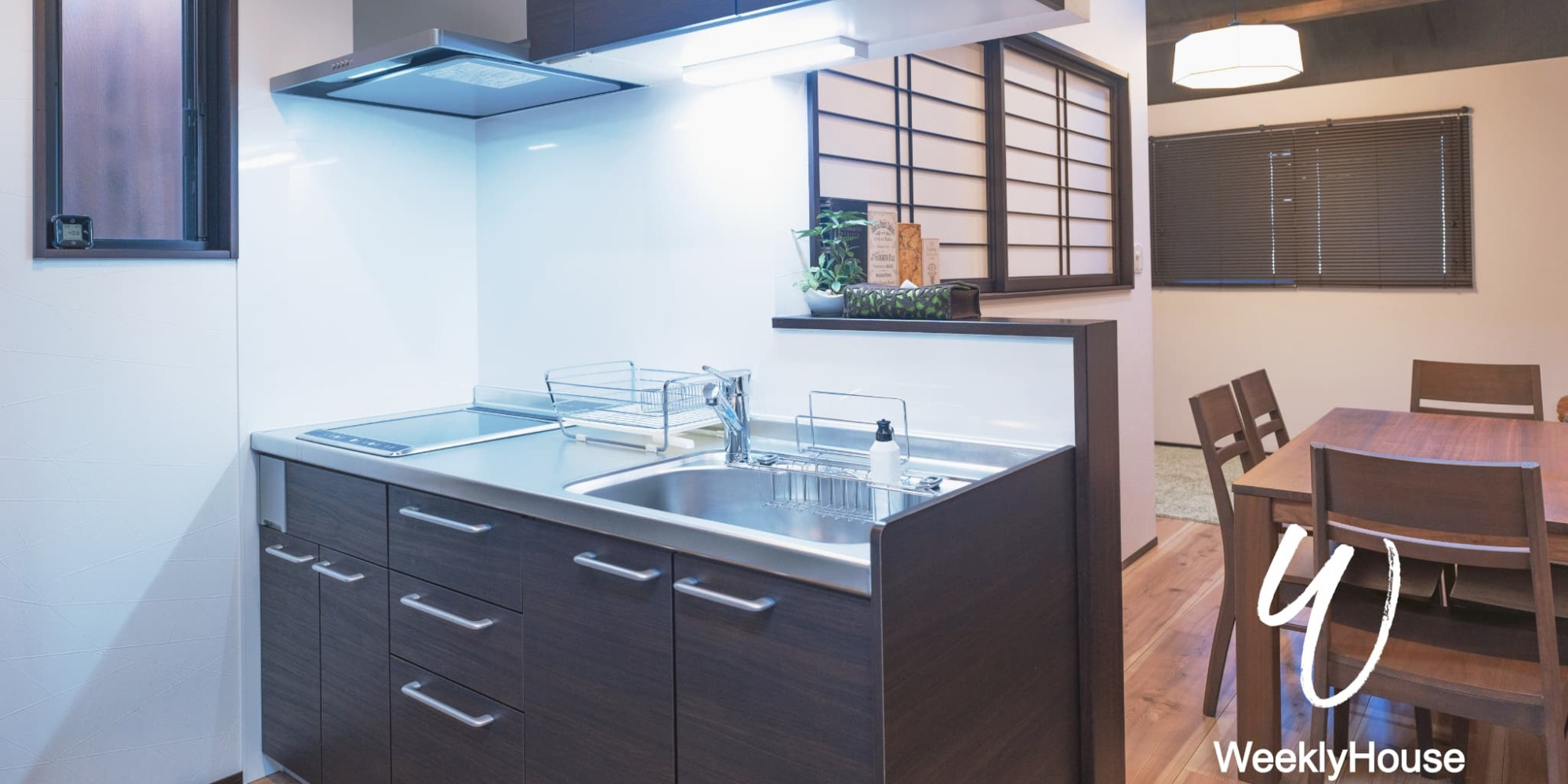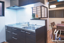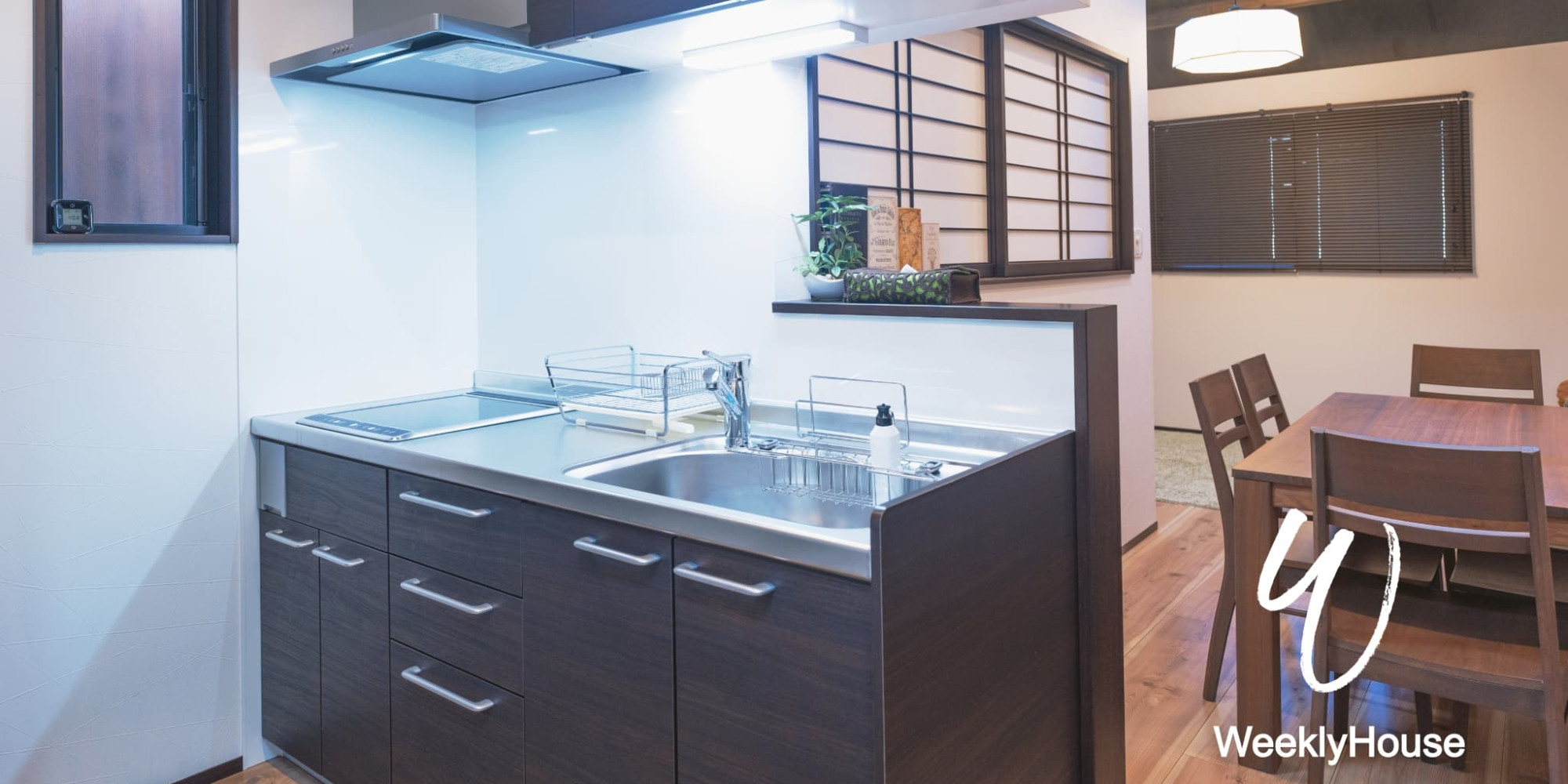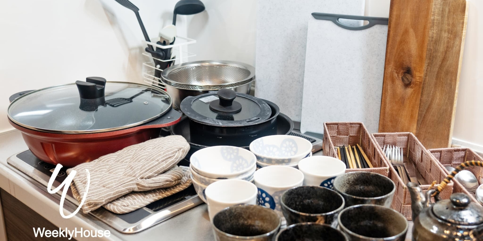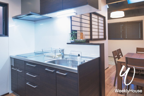 大きなキッチンがございます。 フライパン、片手鍋、まな板、包丁などの調理器具も完備しております!