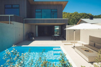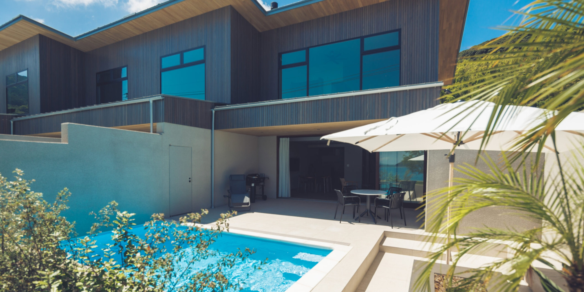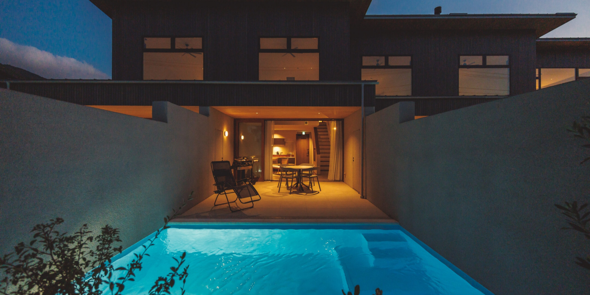 プライベートプールと洗練された家具が配置され、落ち着いた雰囲気が漂います。