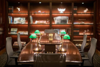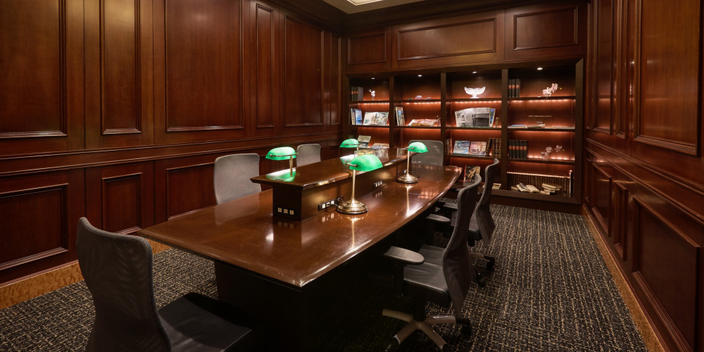 歴史を感じさせる木目の大きな本棚と、豪華なインテリアのビジネスルームでは、