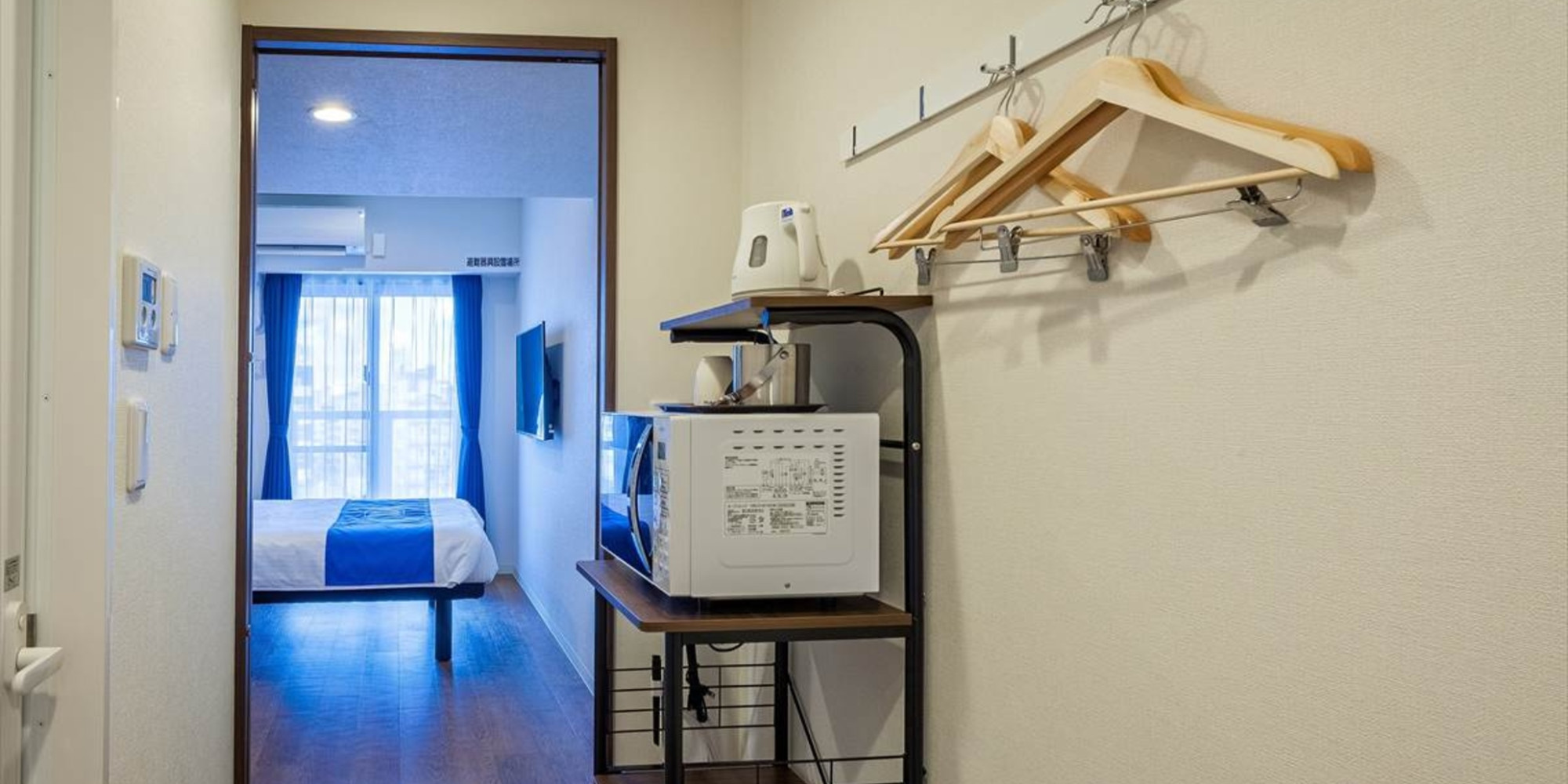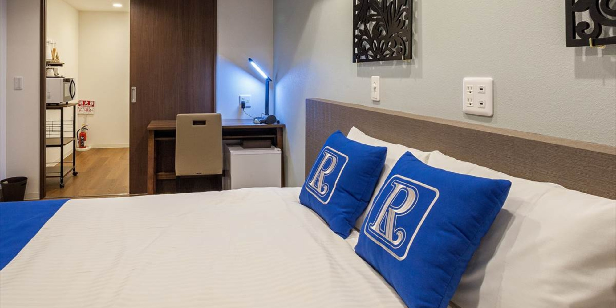 お一人でもお二人でも快適にお過ごしいただけるお部屋です。フランスベッド社ダブルベッドは快適な寝心地で安眠へ誘います。無料Wi-Fi、電子レンジ、洗濯乾燥機を備えます。