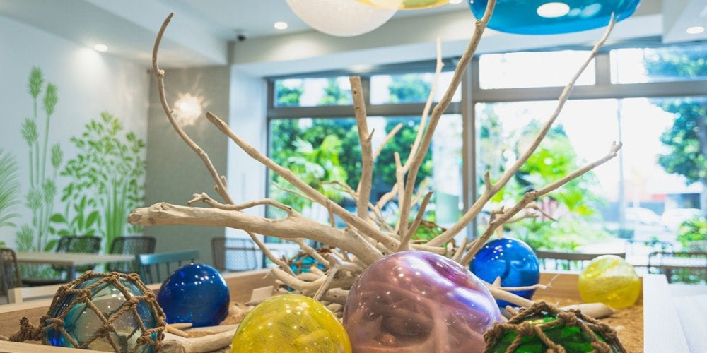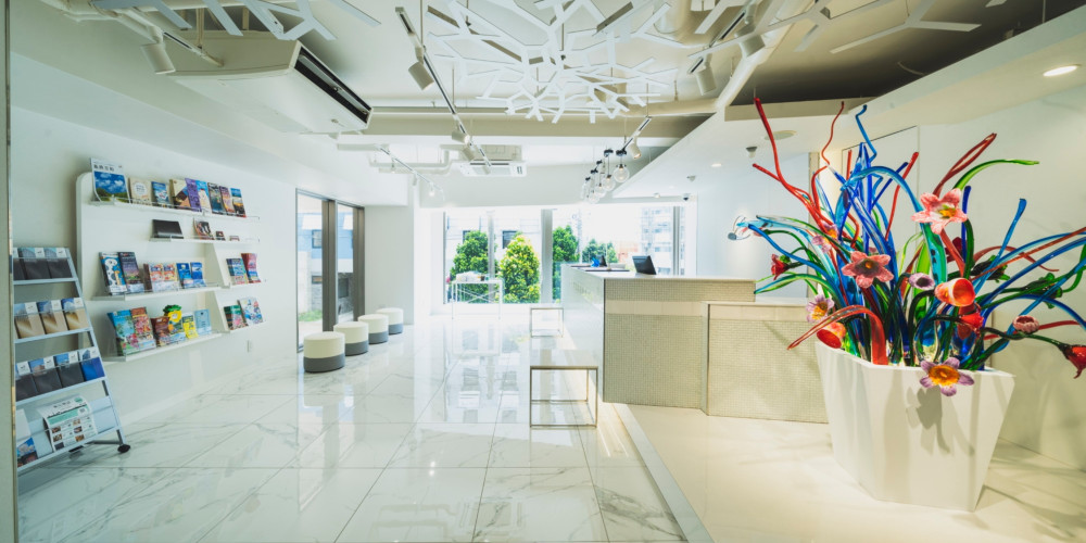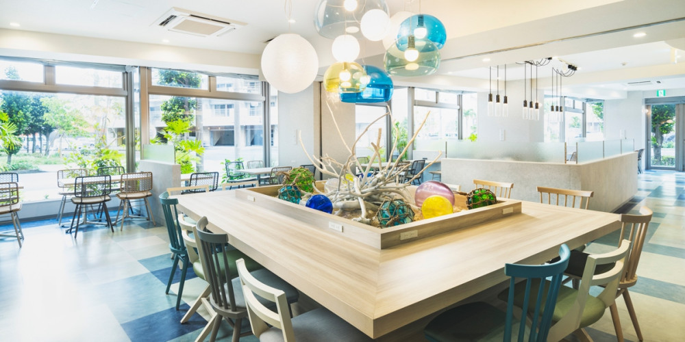 青を基調にした開放的な空間で、海中の珊瑚をイメージした琉球ガラスが輝きます。