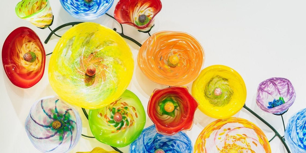 展示している琉球ガラスは鮮やかな色彩で、白い砂浜と砂浜に輝く鮮やかな貝殻を表現。