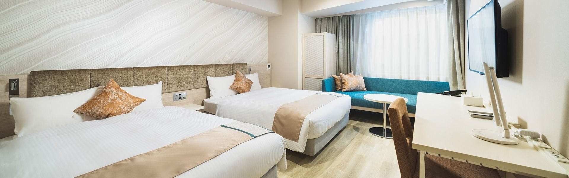沖縄の空や海をイメージし、ブルーを基調とした客室。
