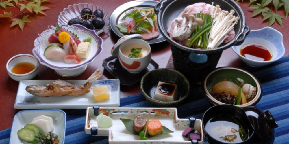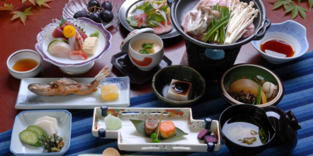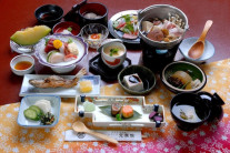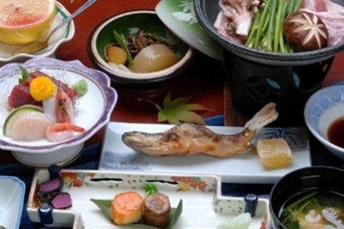 地元の素材を盛り込んだ手作りのお料理が大好評!名物猪鍋と岩魚骨酒は当館おすすめの一品です。是非一度お召し上がりください。