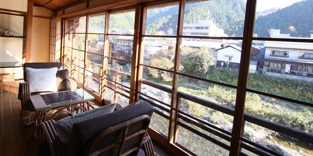 その雄大な流れを崖の上から一望する「じょうが渓房」は、自然と歴史が調和する特別な滞在スポットです。