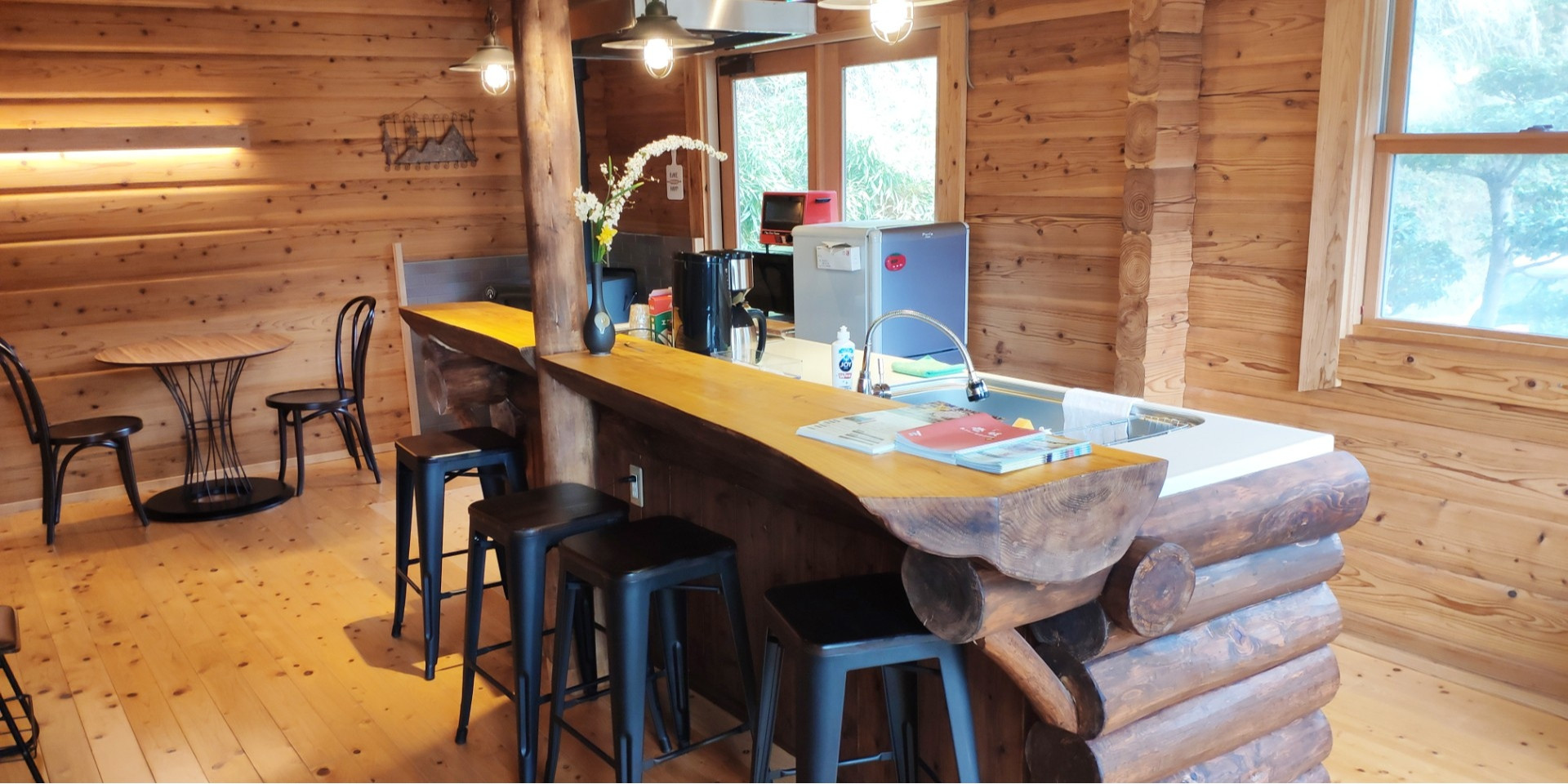 丸太で出来たカウンターに作った料理を並べて、食事を楽しむのもオススメです。