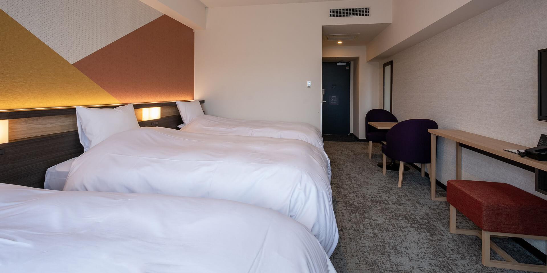 ツインプラス。広々29平米、110cm幅のベッド2台と、102cm幅のスタッキングベッドをご利用頂いて最大3名様までご利用頂けます。