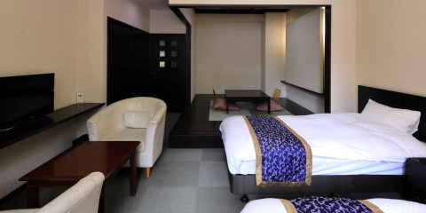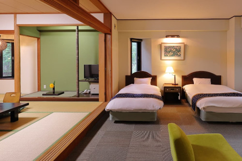 畳のエリアと洋風のベッドが調和しており、伝統と現代の美しさを楽しむことができます。