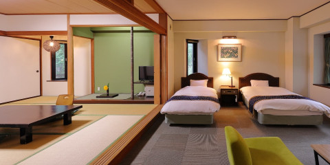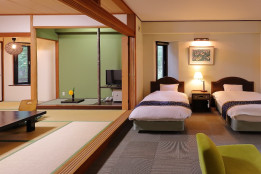 伝統的な和の要素とモダンな洋の快適さが融合した客室は、広々として開放感があり、家族連れやグループでの滞在にも最適です。