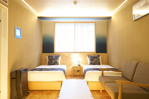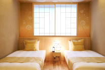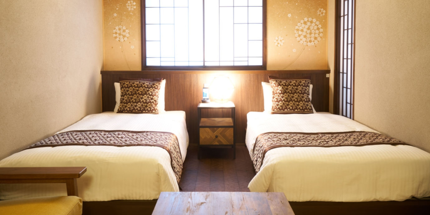 シングルベッド 2 台、シングル布団 2 セット、ローテーブル、 座椅子を完備しております。