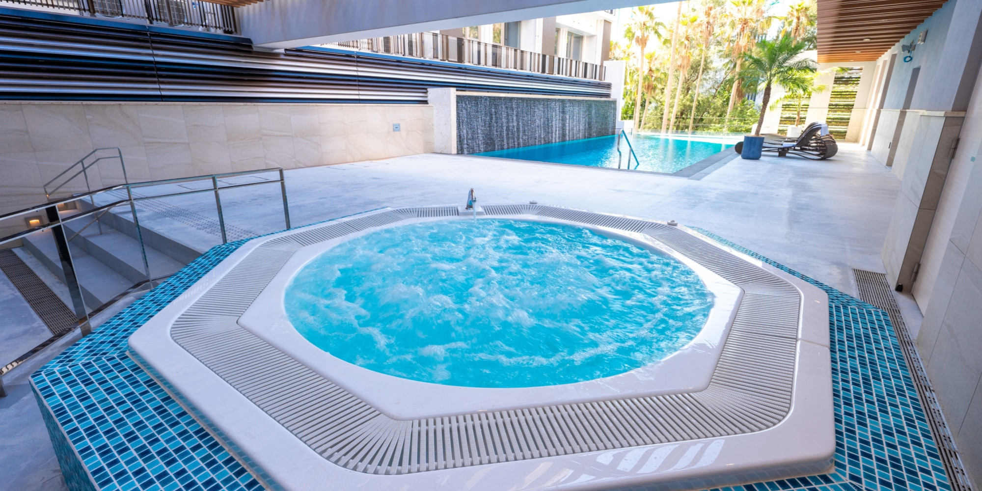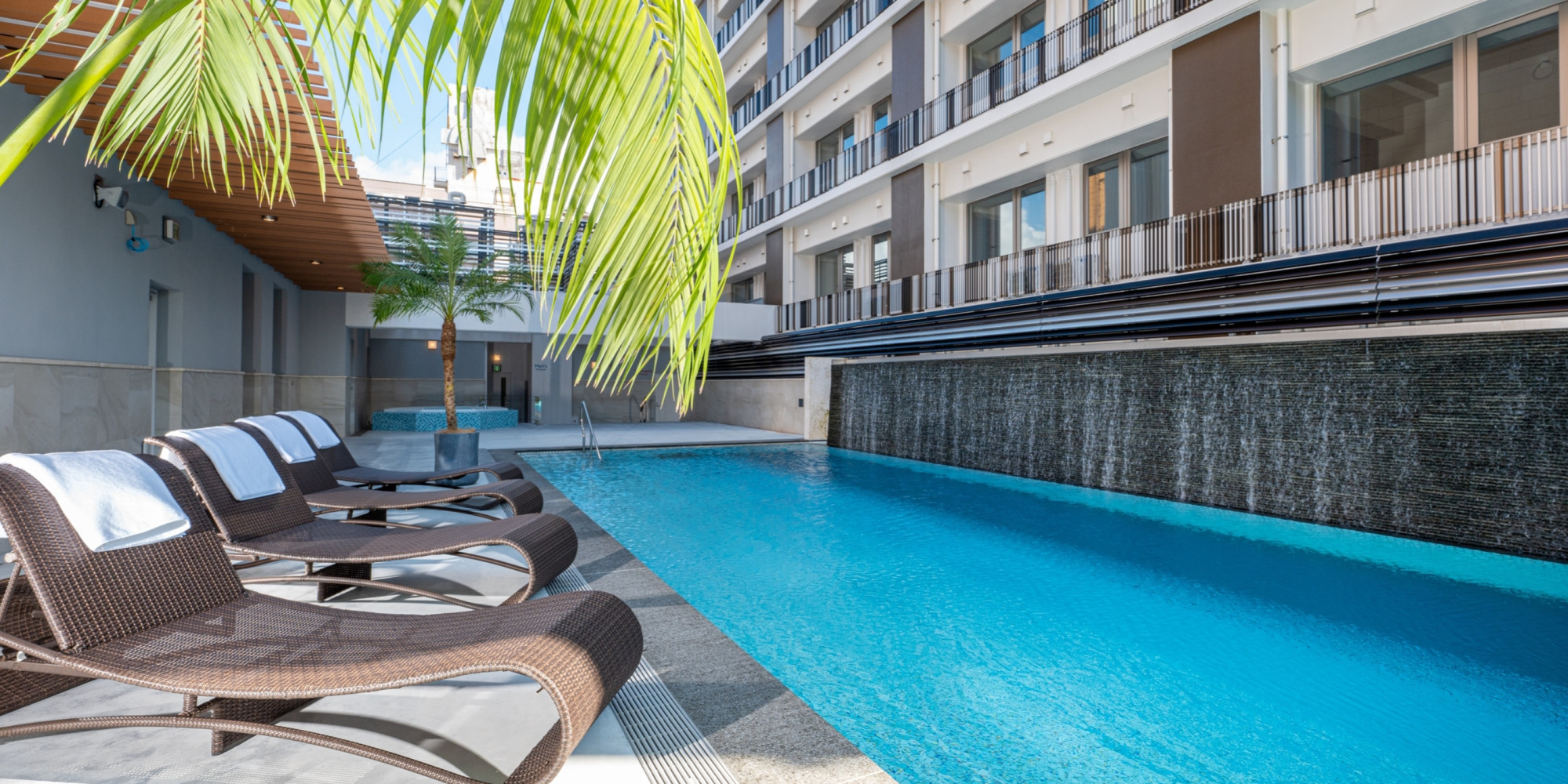 ヤシの樹木と流れる滝が 南国ムードを演出するシースループールには身体を温めるジャグジーも完備しています。那覇の都心を忘れて、贅沢な時間を心ゆくまでお楽しみください。