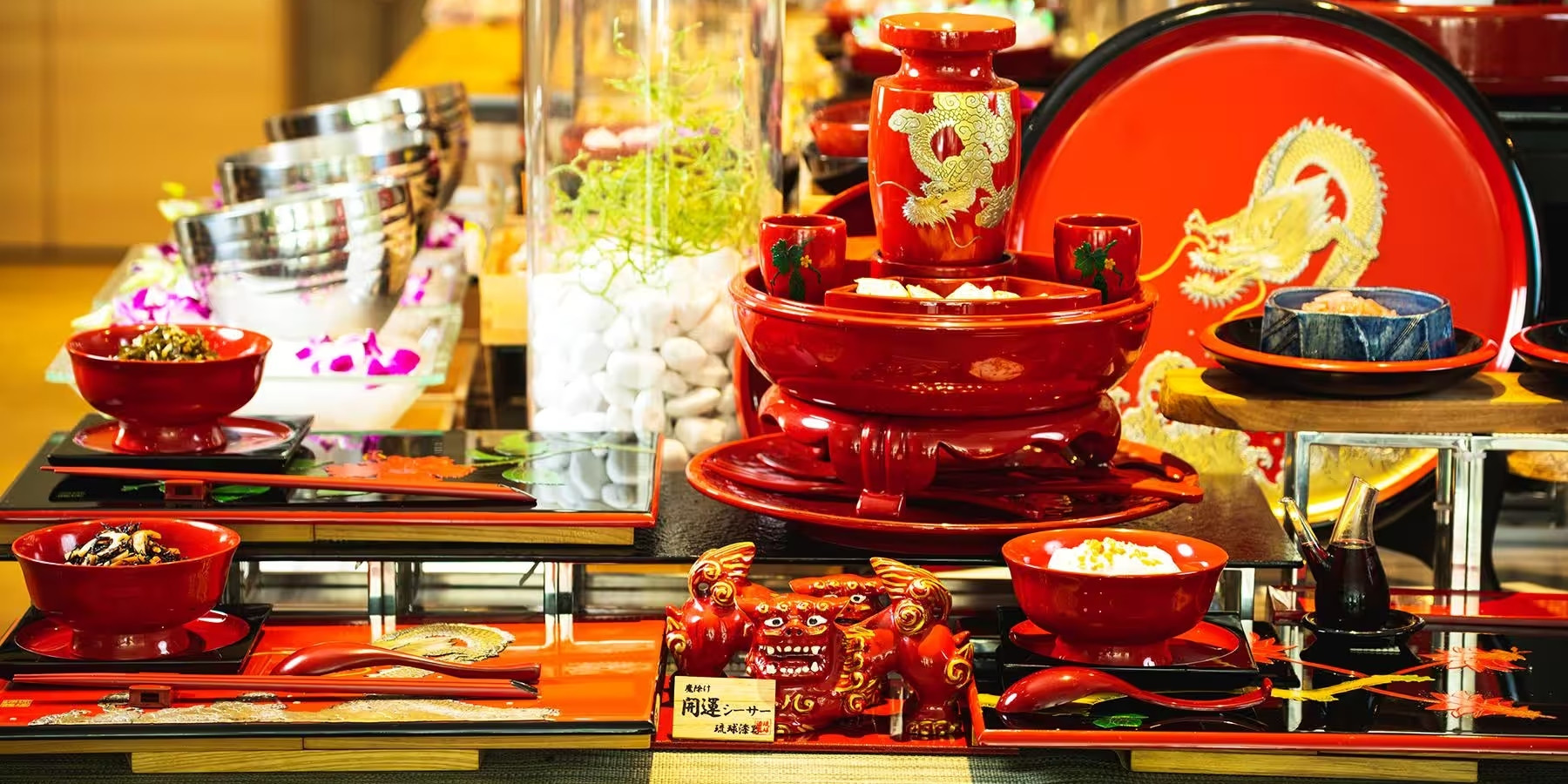 また、琉球王朝料理を伝統工芸「琉球漆器」を器や飾りに使用し目でも味わうおもてなしをご提供しております。