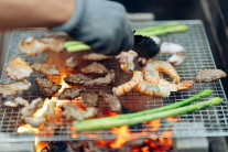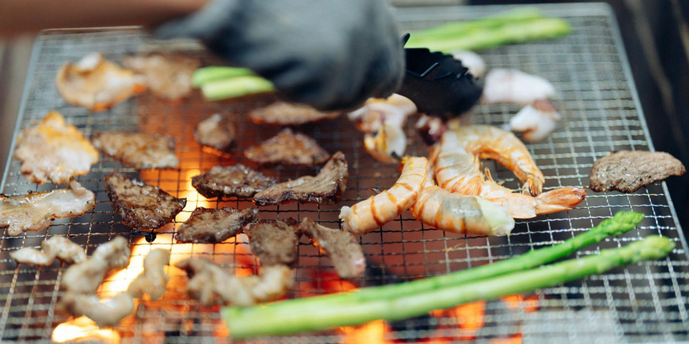 牛肉、鶏肉、栄螺、牡蠣、野菜、おにぎり