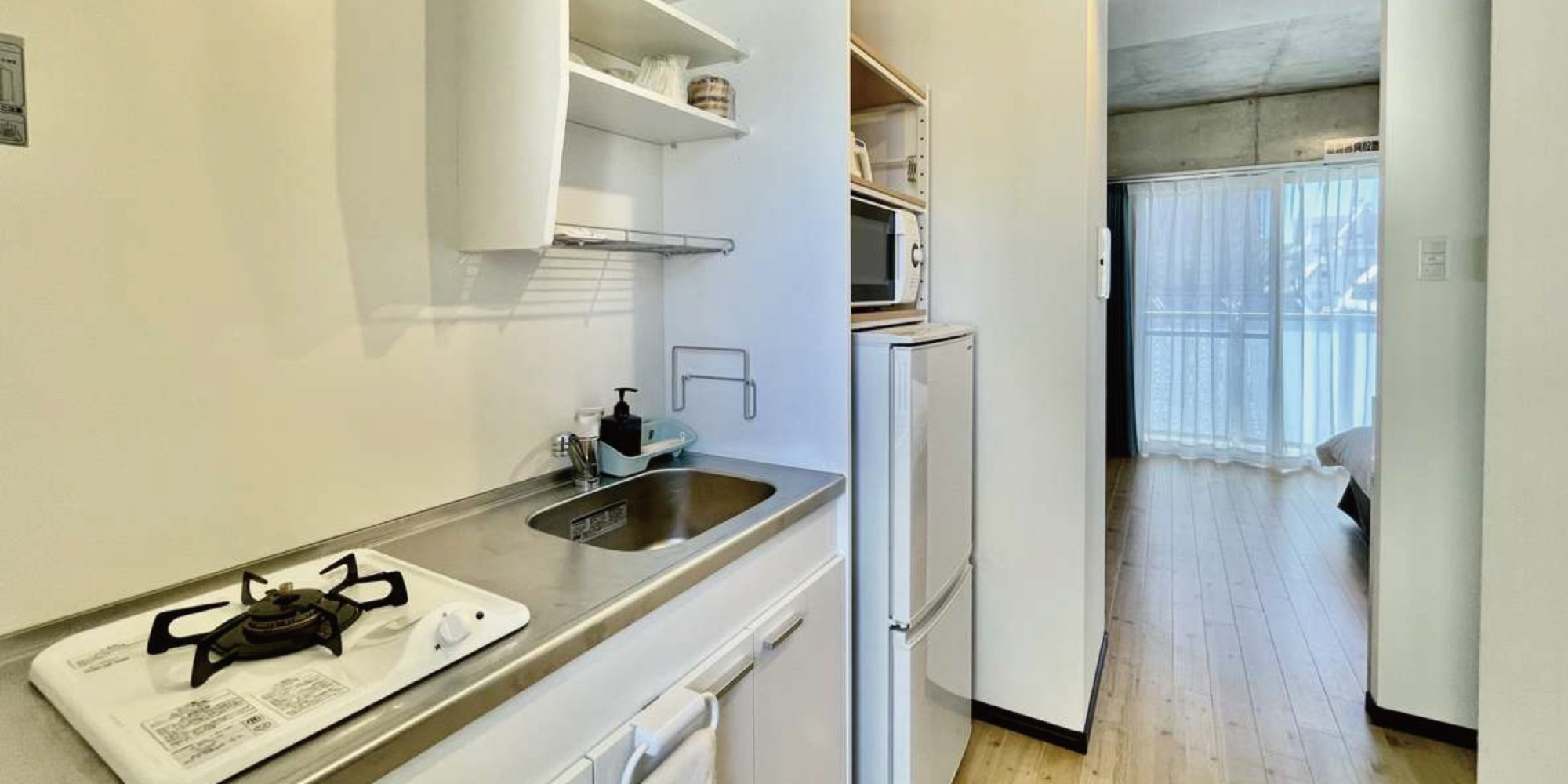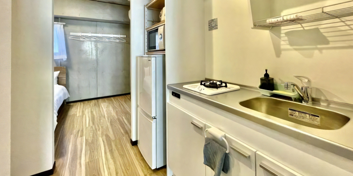 ほとんどの部屋に簡易キッチン(冷蔵庫、電子レンジ、コンロ)と洗濯機・乾燥機が