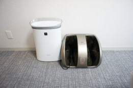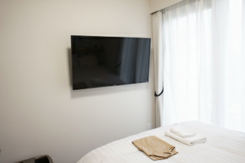 全室に50型テレビや携帯電話マルチ充電器、アルコール除菌スプレーなどを完備。