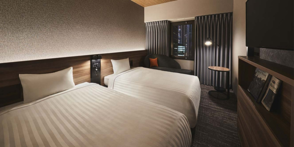 広さ14.6m2、90cm幅のベッドを使用したコンパクトツインルーム。