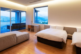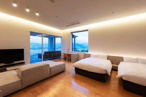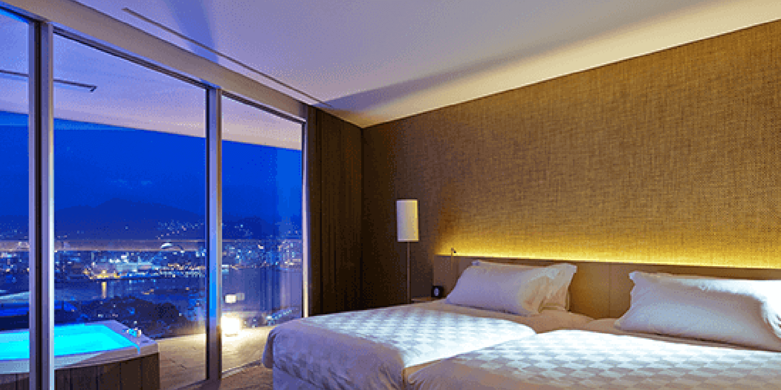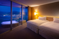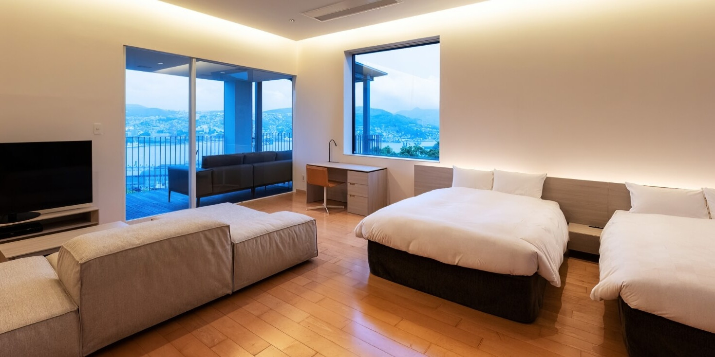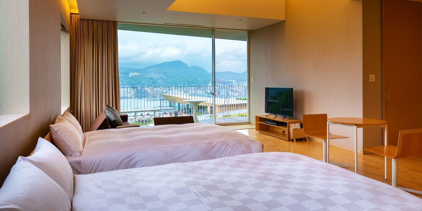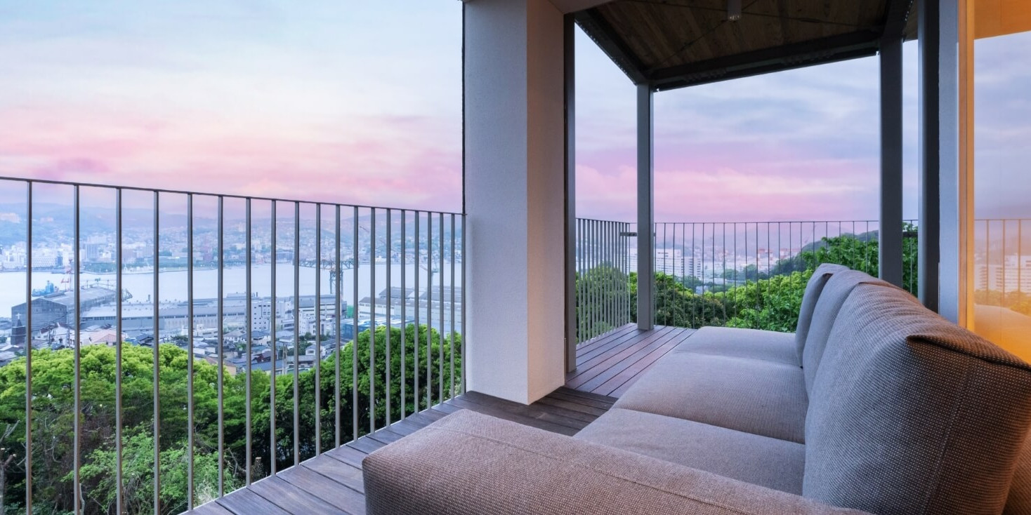 新館ロイヤルテラスの高層階に位置するラグジュアリールーム。長崎の街を一望できるテラス。
