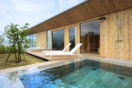 無垢のウッドデッキにジャグジー、ソファセットなどが整備され、日中は海と空、プールが一つになり、
