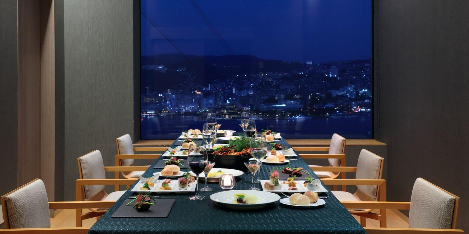 海の幸山の幸に恵まれた長崎ならではの旬の食材を長崎の街の光が映し込む 長崎港を眺めながらじっくりとご賞味下さい。