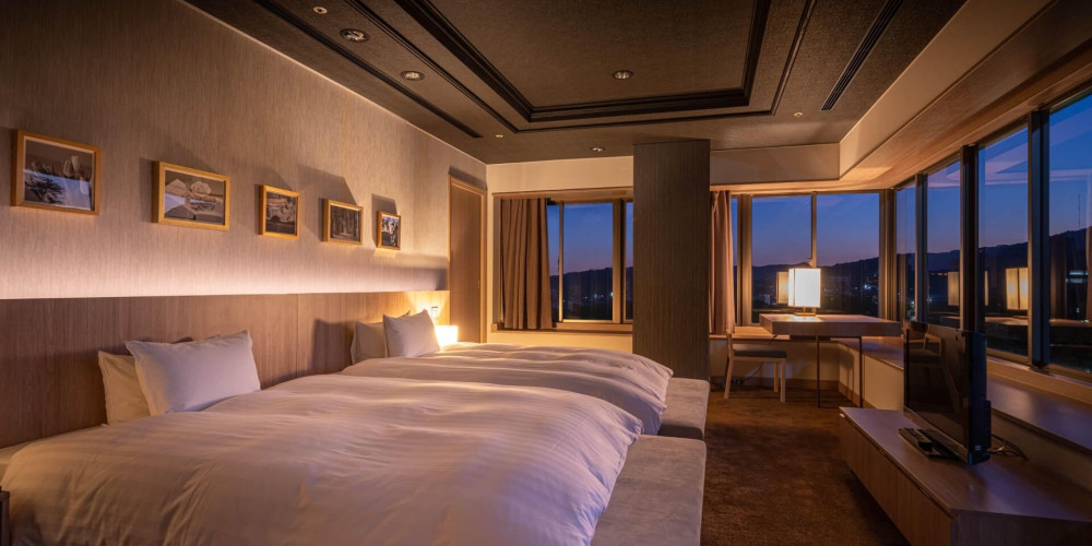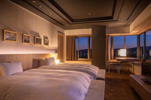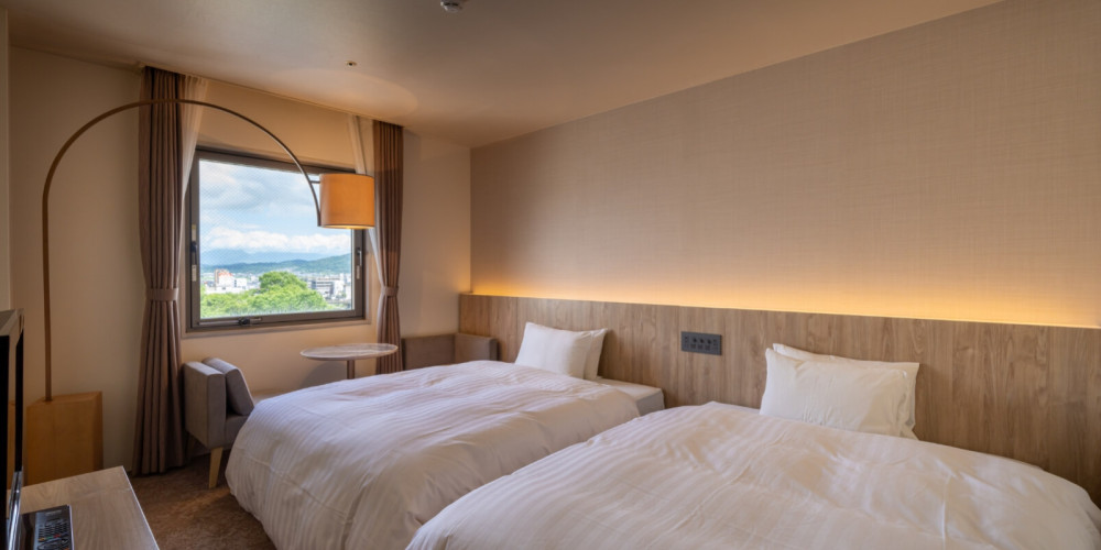 間接照明が印象的で、落ち着いたモダンな雰囲気のツインルーム。