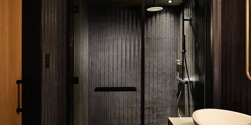 岐阜県多治見市のタイルを使用した、ブラックヘリンボーンデザインのシャワーブースです。