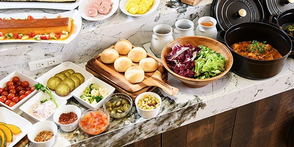 森の爽やかなイメージのレストランで、シェフこだわりの出来立てビュッフェが味わえます。
