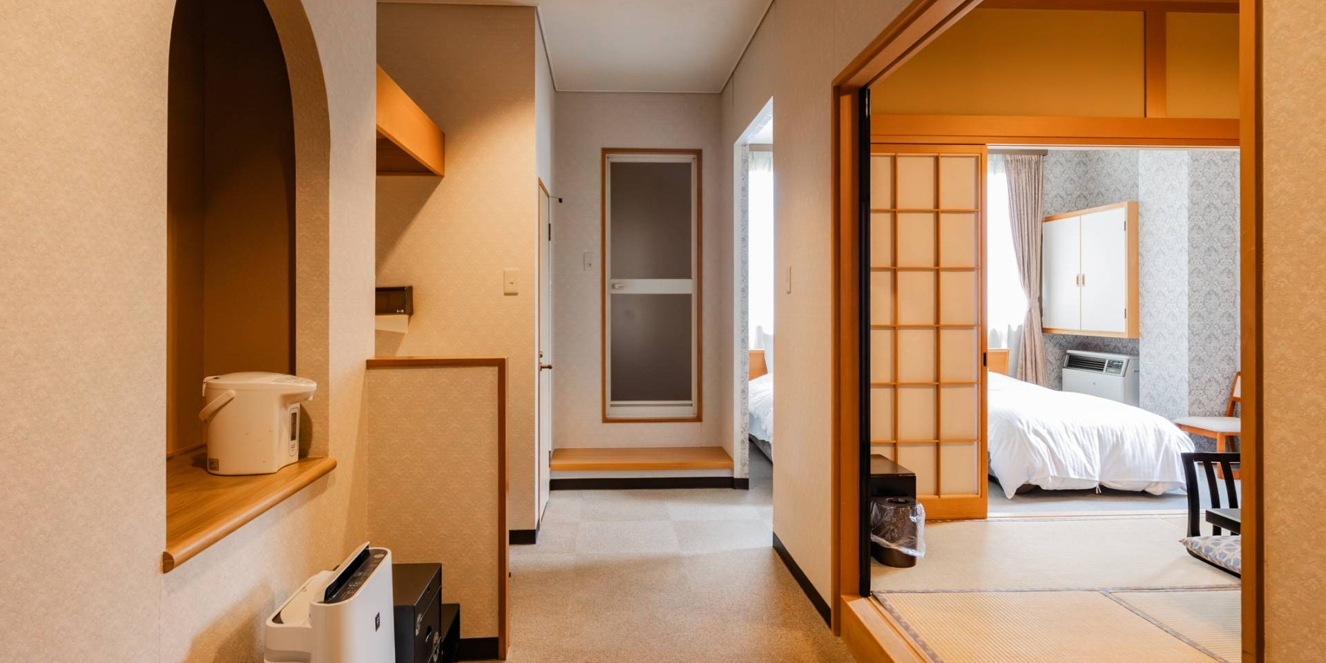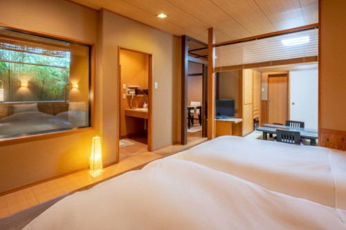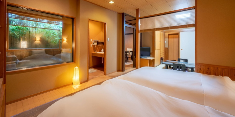 温泉半露天風呂とダイニング、和室、ツインベッドという広めの和洋室。
