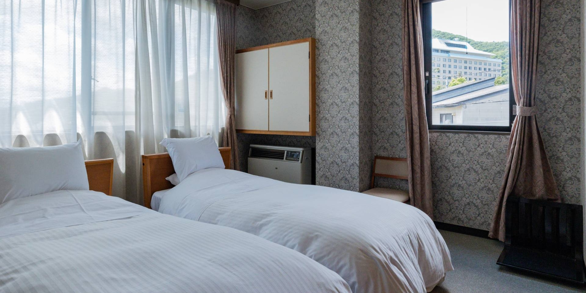 温泉内風呂と和室、ツインベッドというこじんまりとしてお部屋です。
