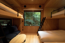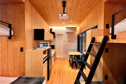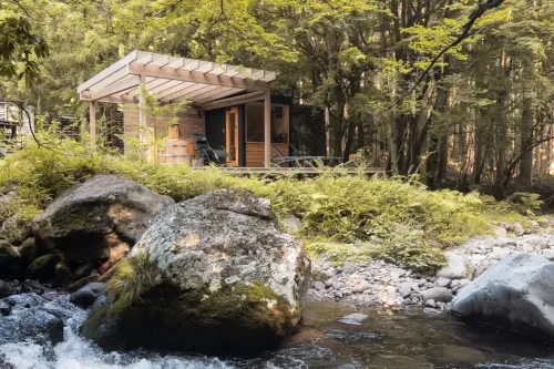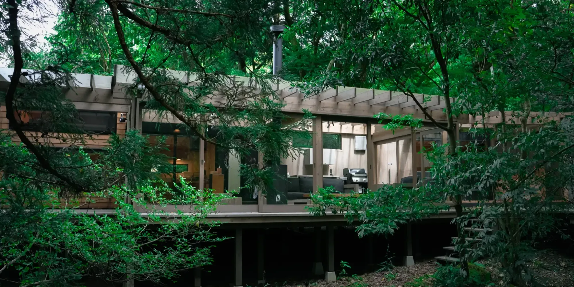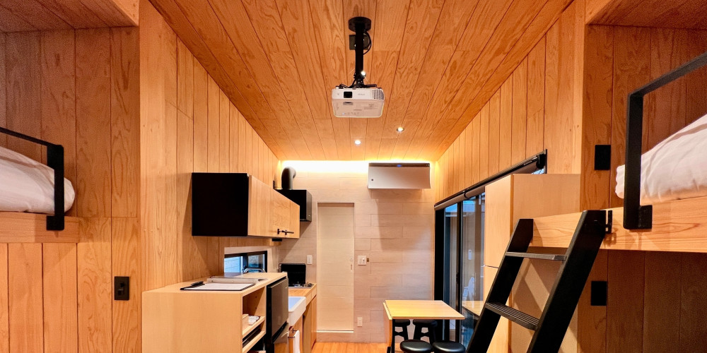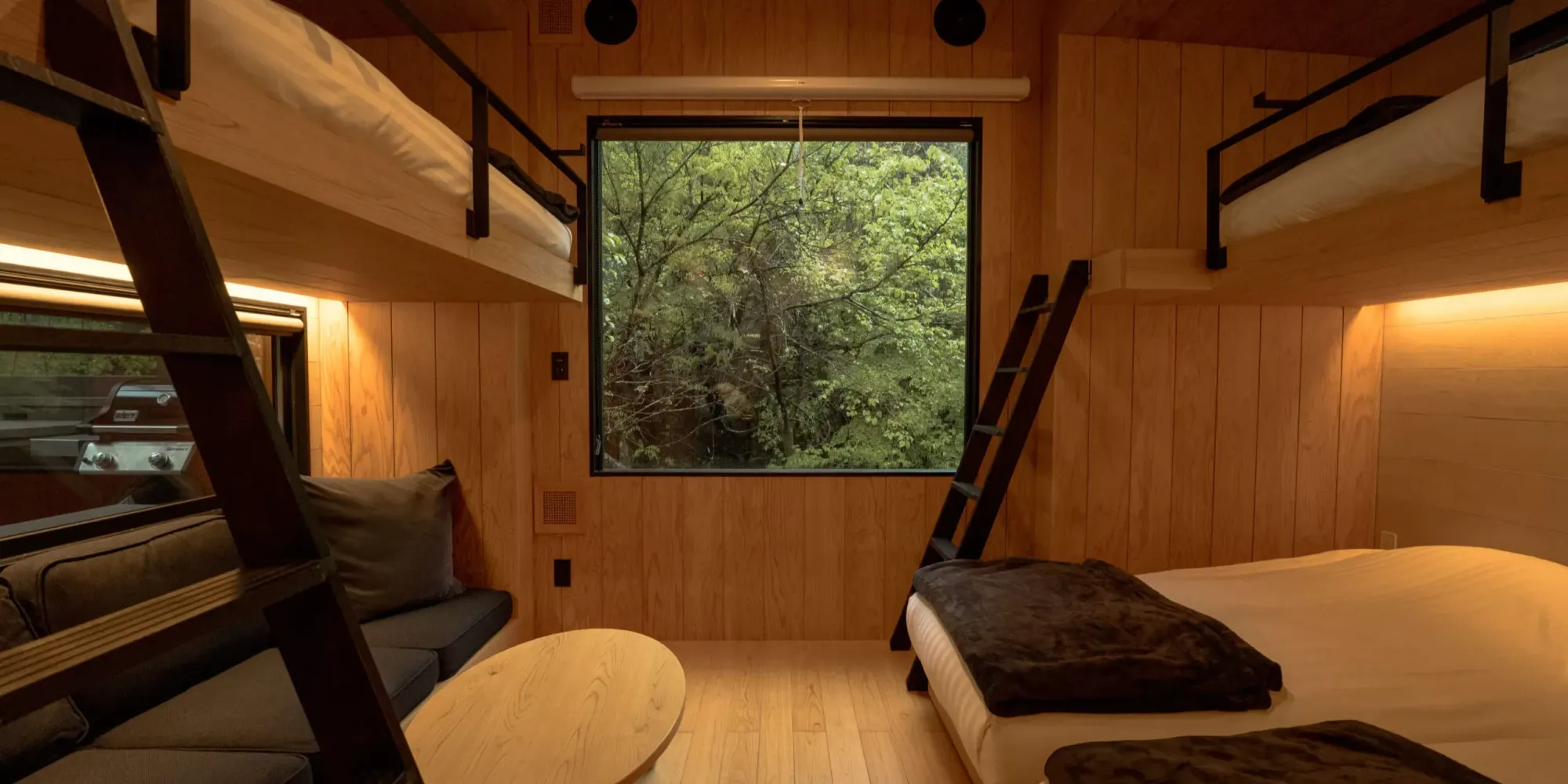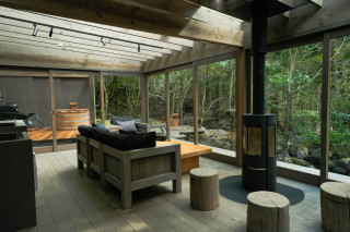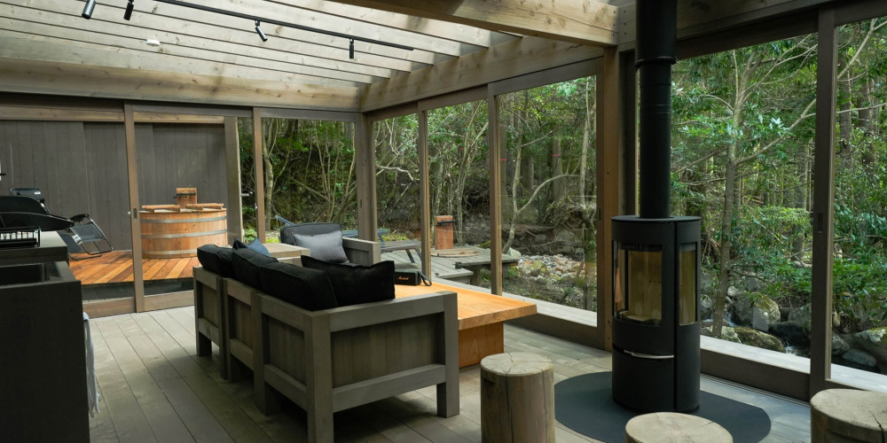 河津の山の奥深く、小川のほとりに建てられた、自然豊かな空間が魅力のスイートトトレーラーハウス。リビングデッキからは、川と緑豊かな森林が目前に広がり、寝室、リビングデッキ、サウナ、各エリアが横長に広がるプライベートヴィラ。