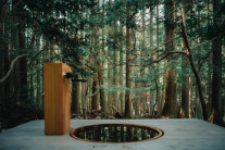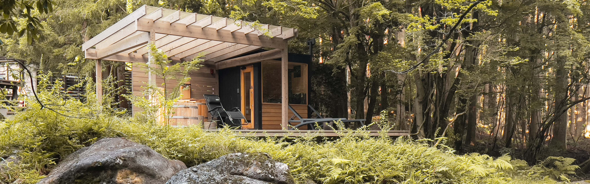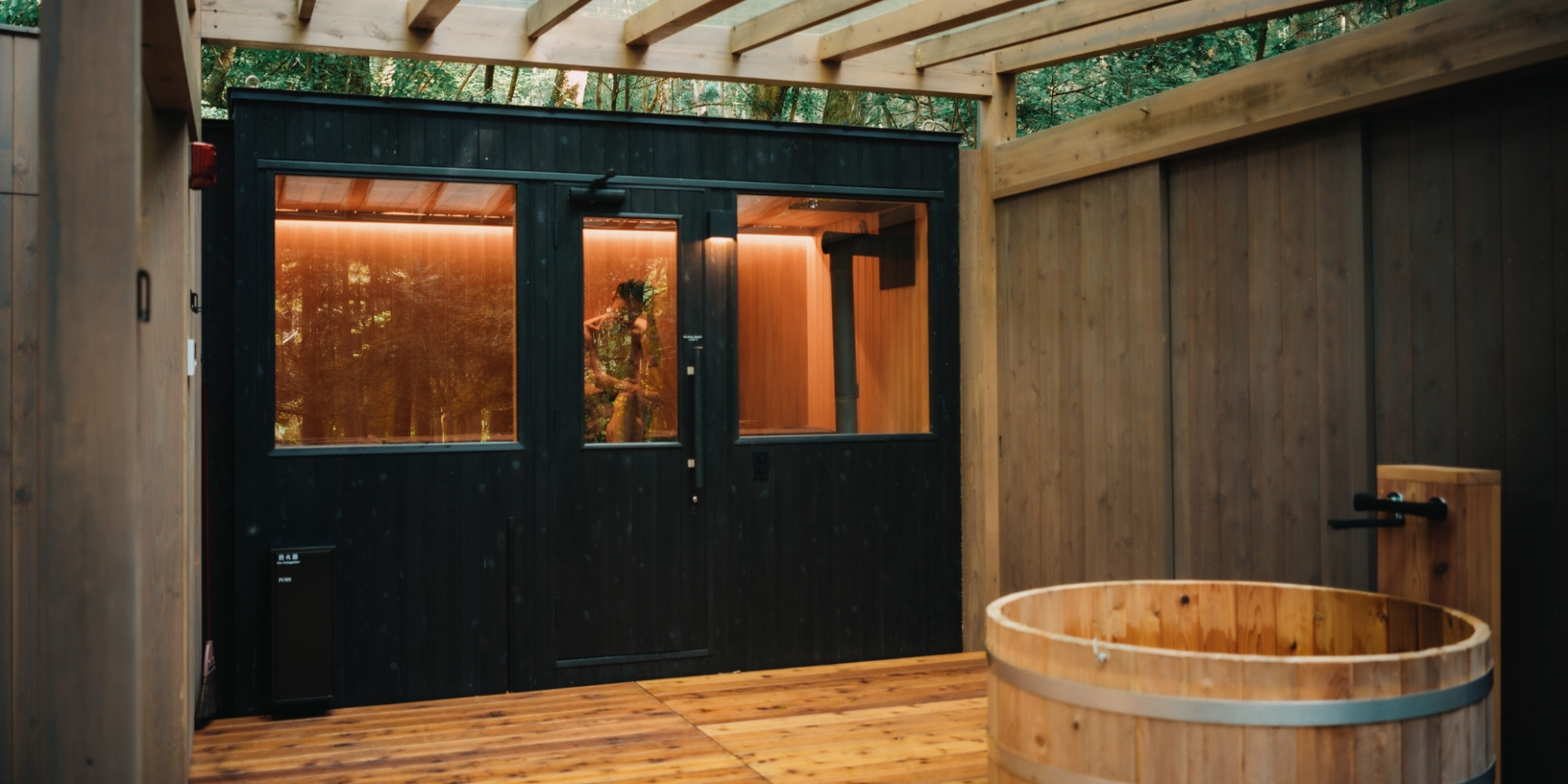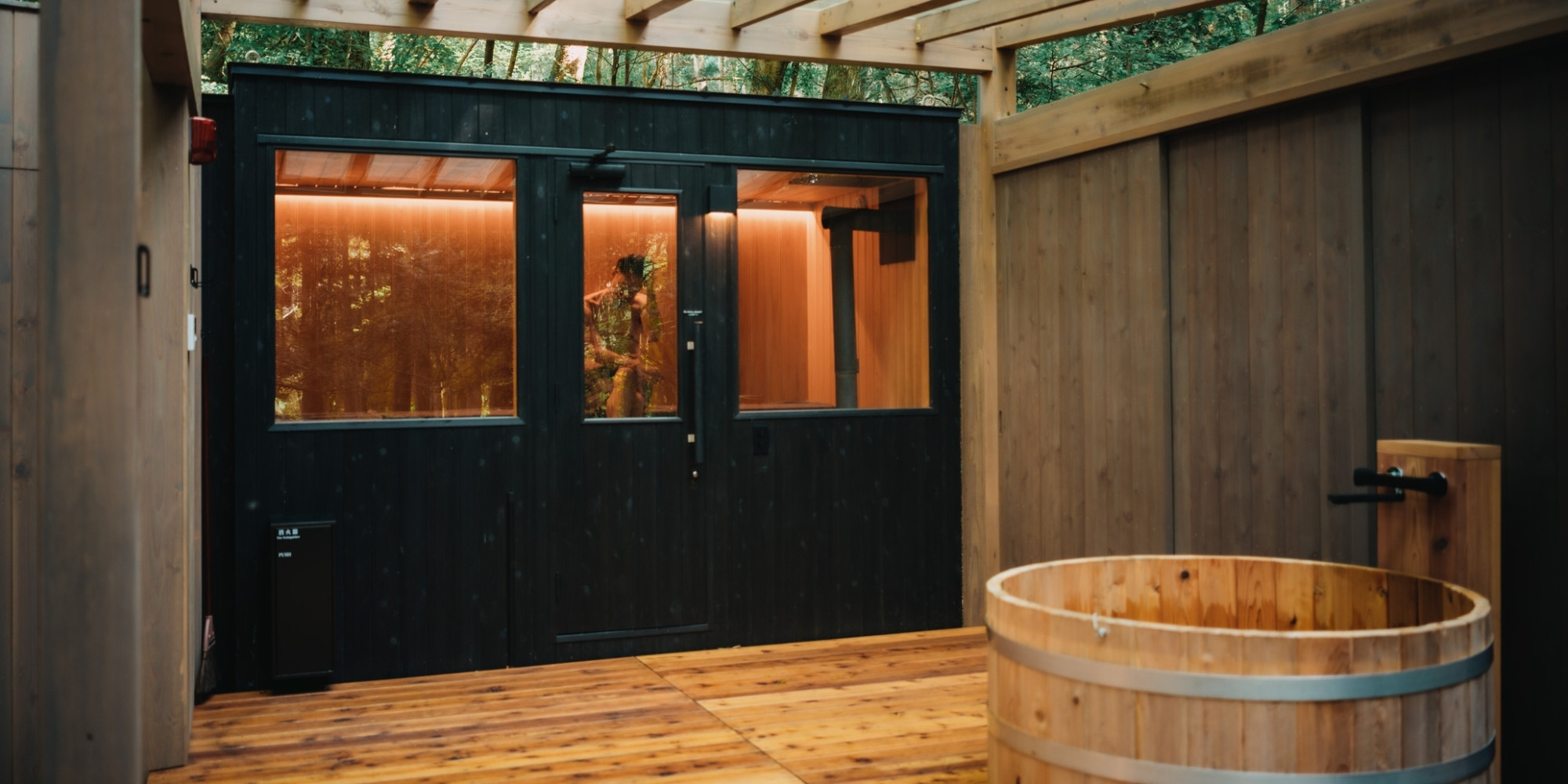 フィンランド式の薪サウナは、2段L字構造。足を伸ばして寝転がれる広さがあります。檜の樽風呂の一つは、デッキに埋まっていて、より自然との一体感を味わえます。