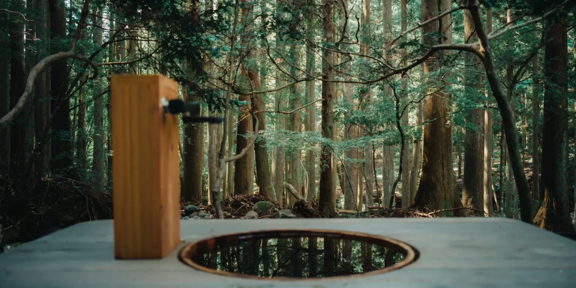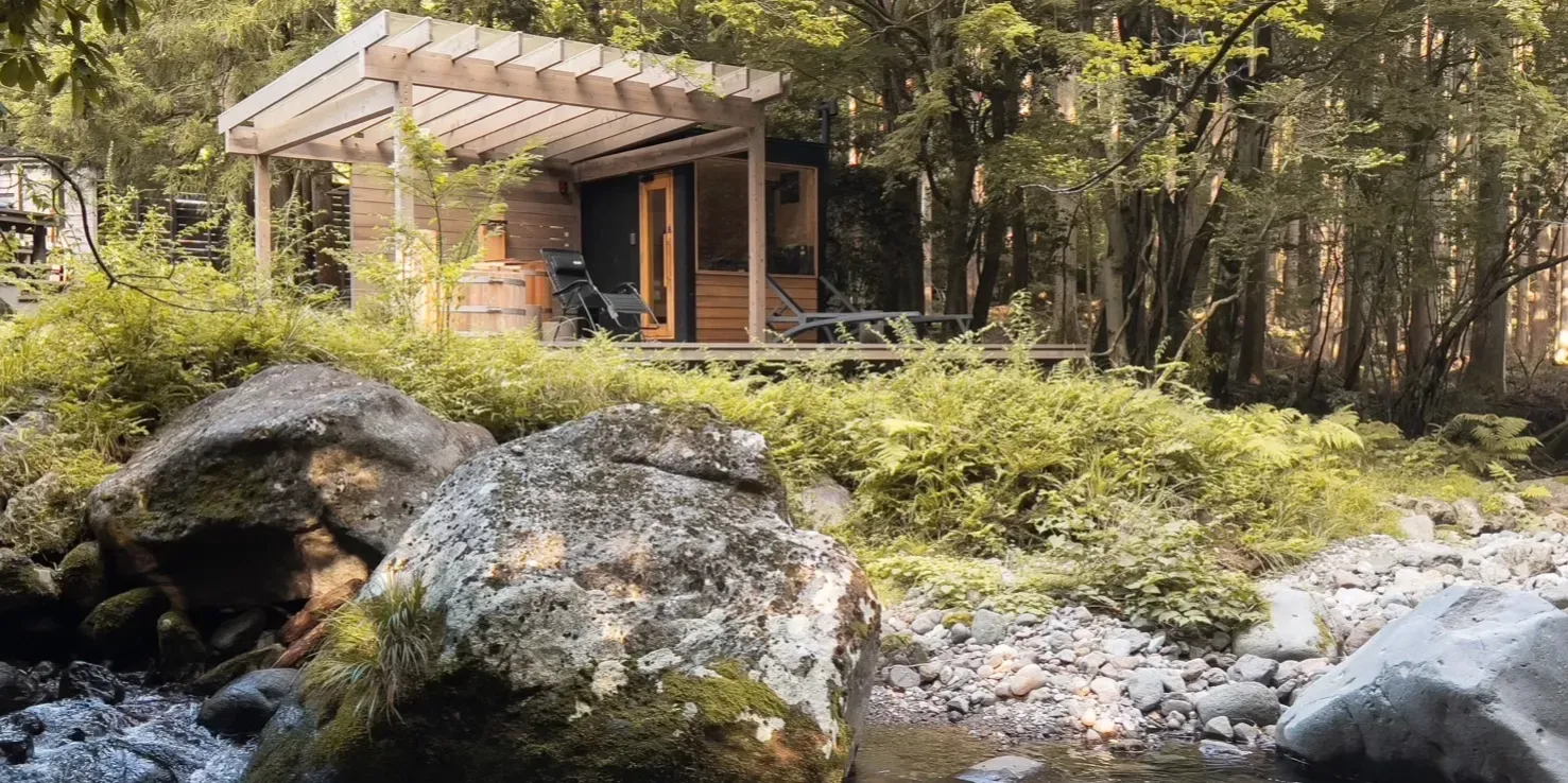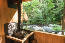 河津の山の奥深く、渓流の傍に建てられた、自然豊かな空間が魅力のスイートトレーラーハウス。寝室、リビングデッキ、サウナエリアと高低差があり、縦長に広がるプライベートヴィラは、周囲の景色を俯瞰して見渡すことができます。よりダイナミックな自然を楽しみたい方はこちら。腰の高さまである渓流が脇を流れています。