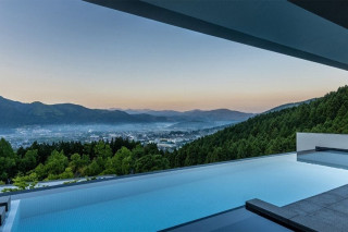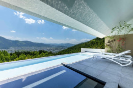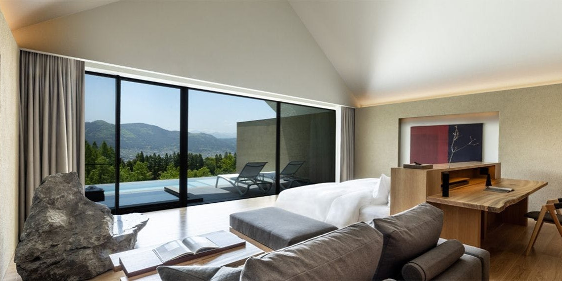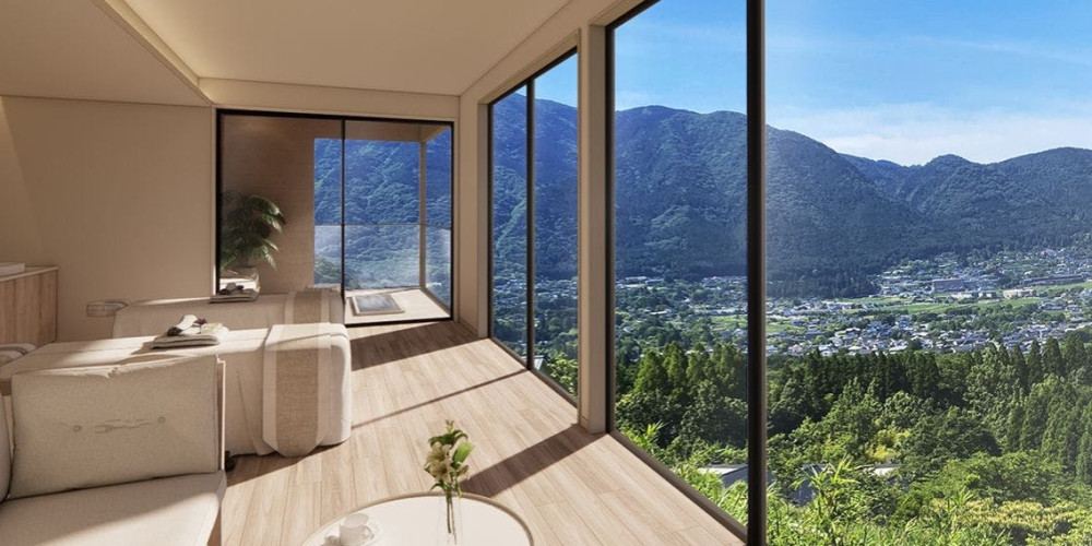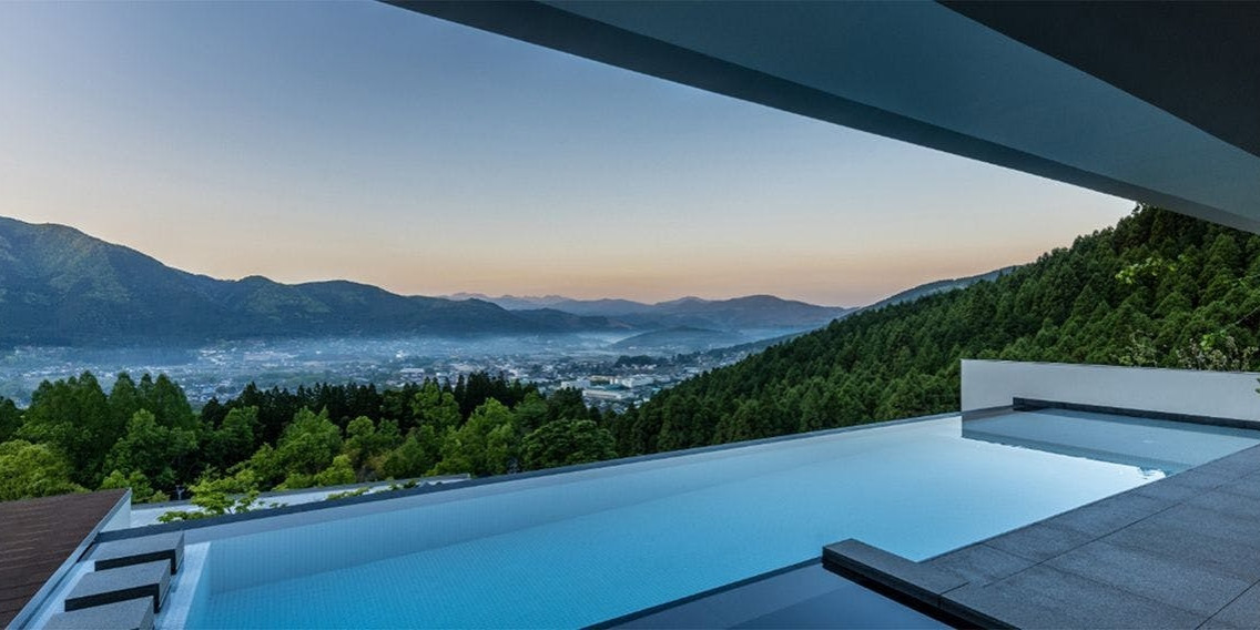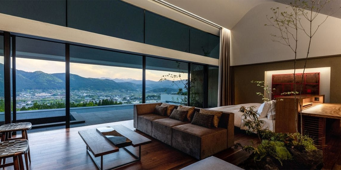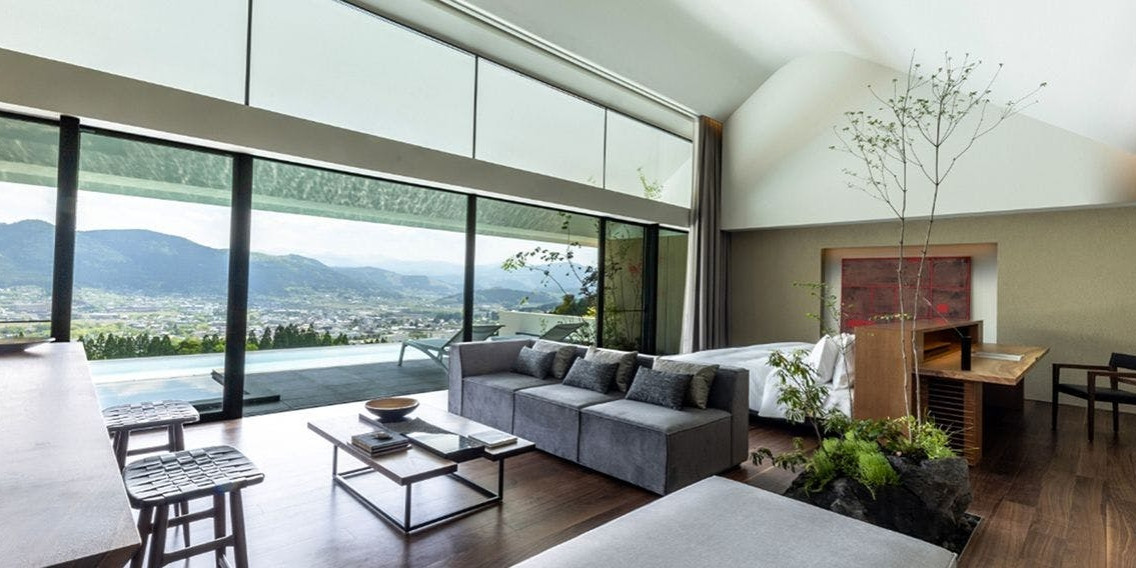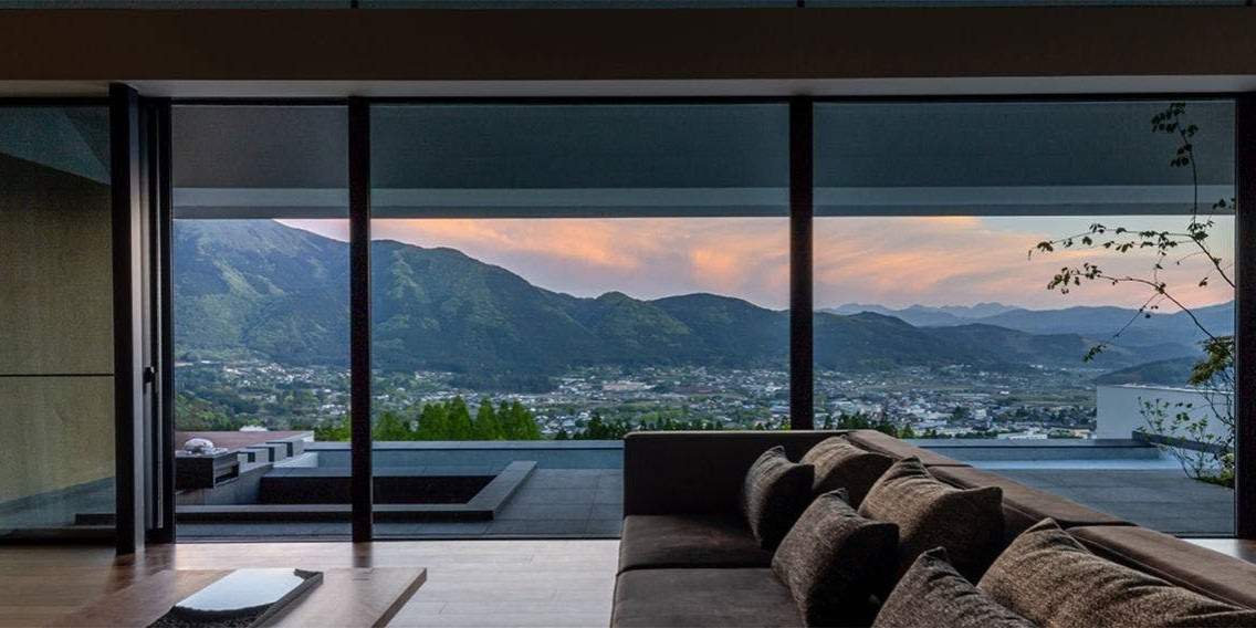 窓からは由布院の街並みと山並みが広がり、リビングや露天風呂、インフィニティプール、バスタブまでもが景色と一体に。